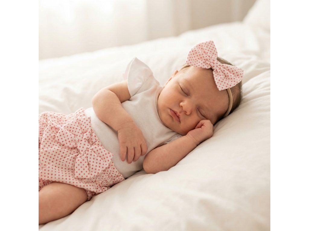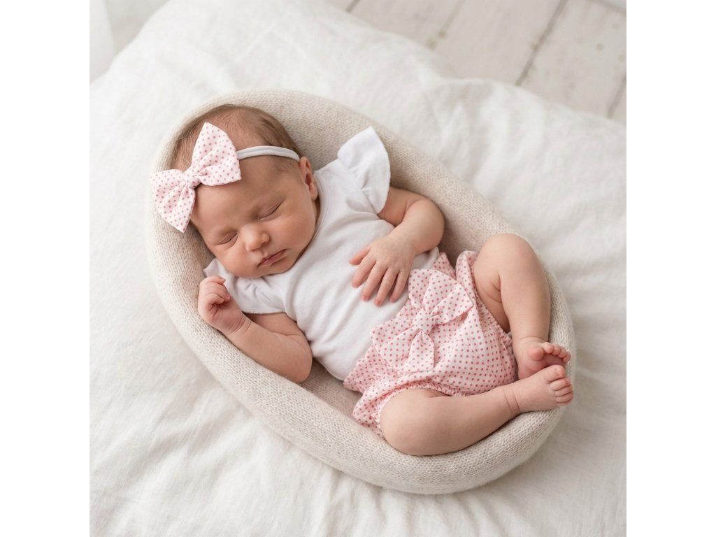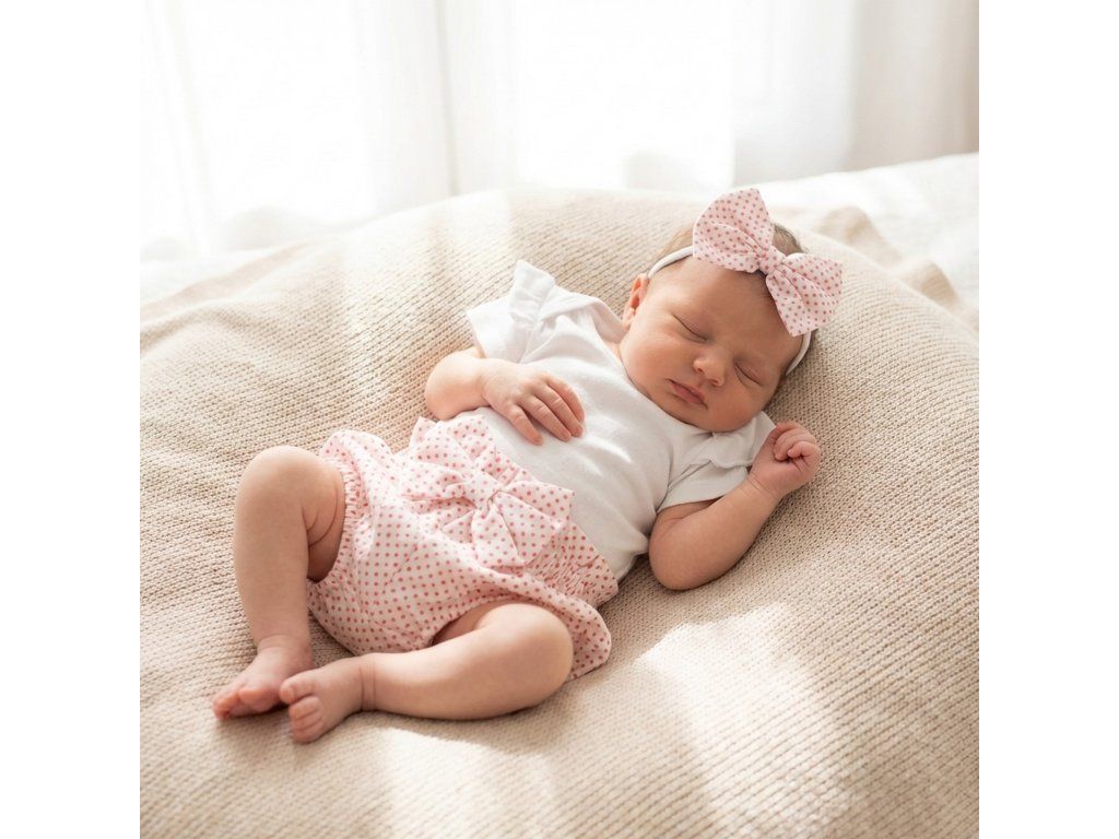 Soupravička obsahuje body s krátkým rukávem, kraťasy a čelenku s mašličkou