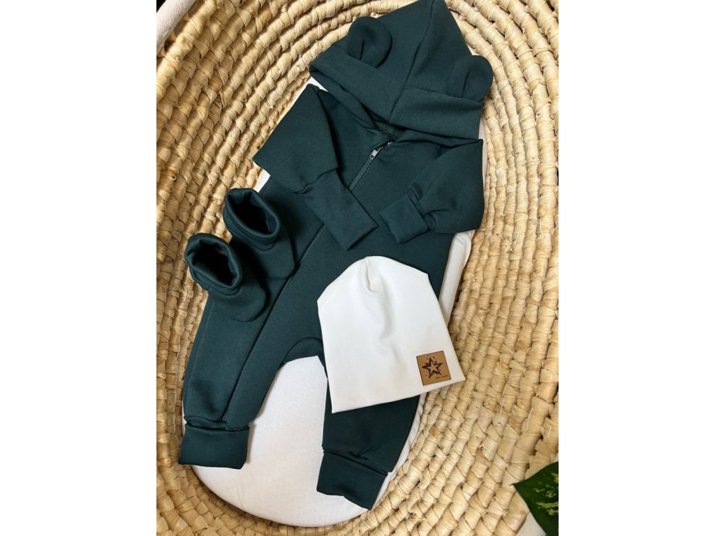 Oteplený overal, botičky a čepička - Tm. zelená