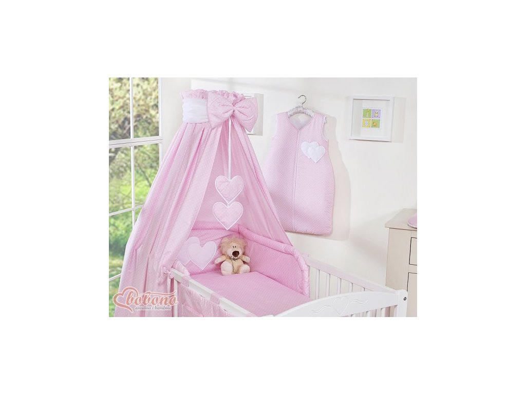 Nebesa celobavlněná. Sahají téměř až k zemi, pod spodní příčky postýlky, takže nespadnou dovnitř ani s matrací spuštěnou na nejnižší úroveň postýlky. Nebesa můžete upevnit na krátkou stranu postýlky, kdy budou krásně nařasené, ale lze je připevnit i na dlouhou stranu. Nebesa jsou doplněná o velkou, tlustou mašli a visící srdíčka, které přitahují pozornost dítěte v prvních měsících a účinně nahrazují kolotoč. Navíc k baldachýnu zdarma dostanete tylovou šerpu, která krásně doplní celou sadu a vypadá tak ještě elegantněji.