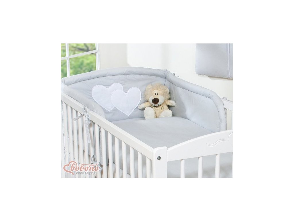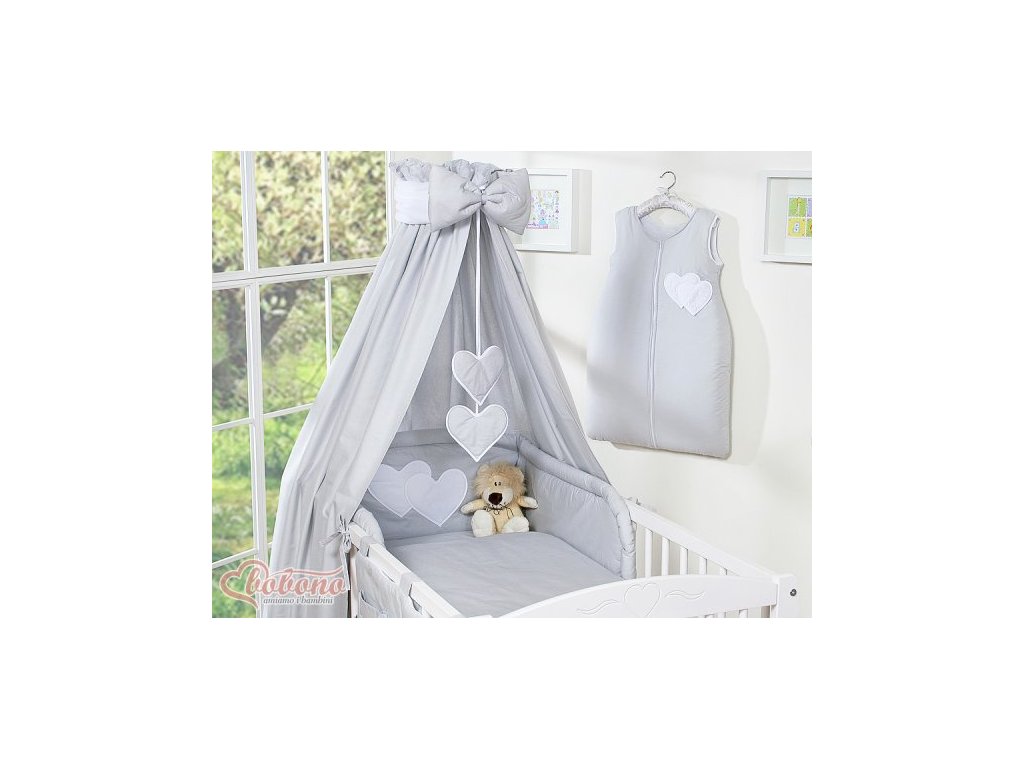 Nebesa celobavlněná. Sahají téměř až k zemi, pod spodní příčky postýlky, takže nespadnou dovnitř ani s matrací spuštěnou na nejnižší úroveň postýlky. Nebesa můžete upevnit na krátkou stranu postýlky, kdy budou krásně nařasené, ale lze je připevnit i na dlouhou stranu. Nebesa jsou doplněná o velkou, tlustou mašli a visící srdíčka, které přitahují pozornost dítěte v prvních měsících a účinně nahrazují kolotoč. Navíc k baldachýnu zdarma dostanete tylovou šerpu, která krásně doplní celou sadu a vypadá tak ještě elegantněji.