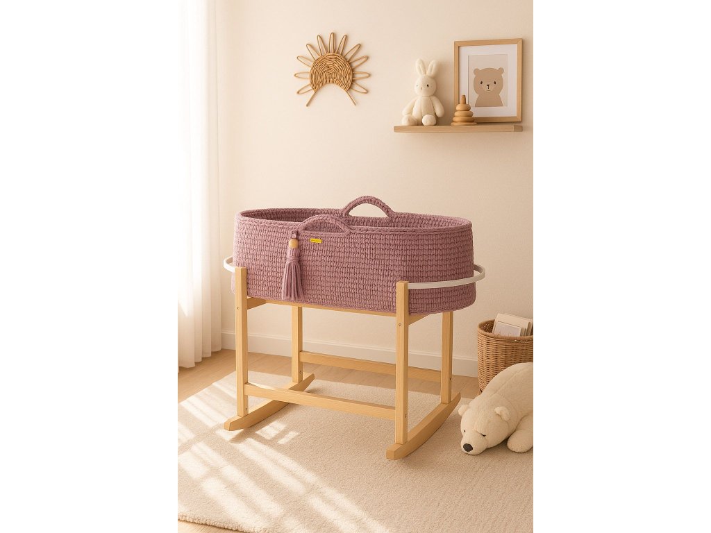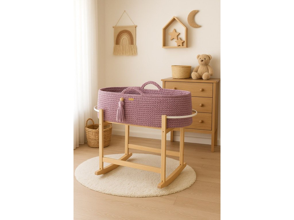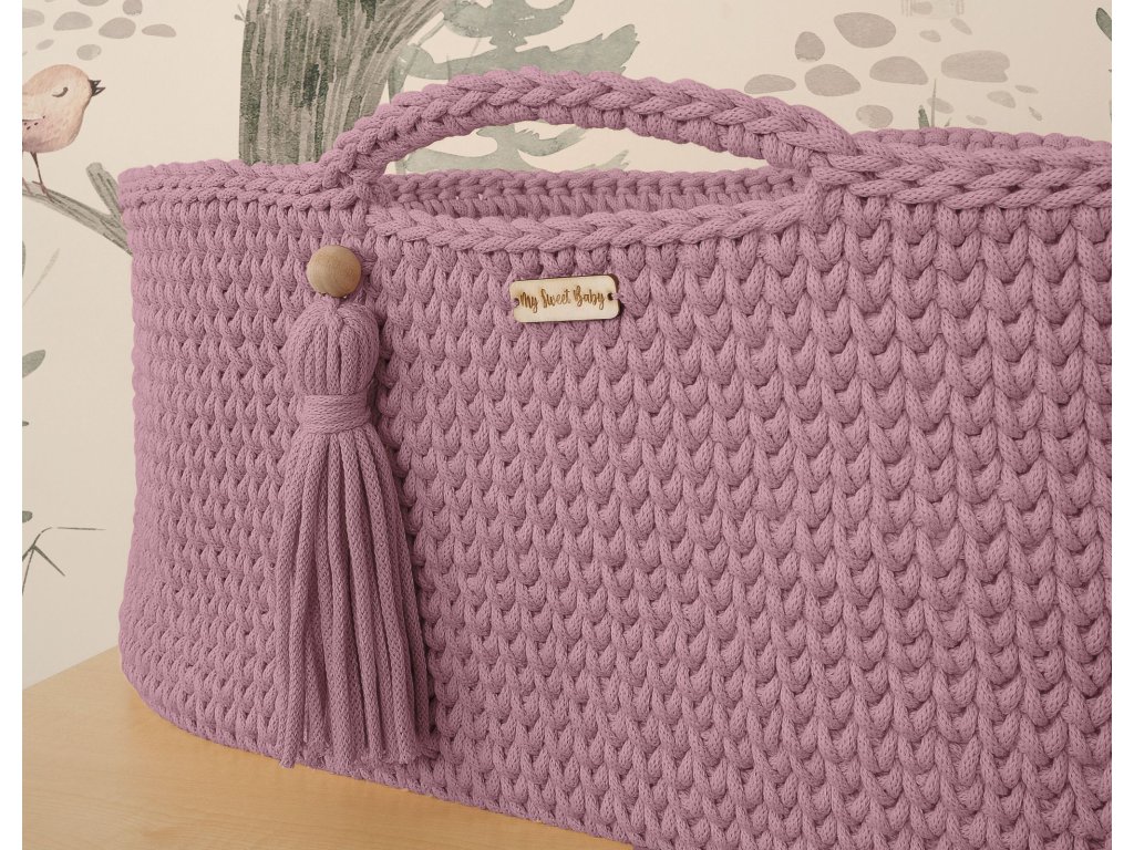 Koš je ručně vyrobený z bavlněného provázku. Díky svým malým rozměrům může košík doprovázet rodiče v každé místnosti. Bavlněná šňůra, ze které je košík utkán, je měkká, jemná a zároveň velmi stabilní. Háčkovaný steh použitý v košíku je mírně prolamovaný, díky čemuž je zajištěna správná cirkulace vzduchu. Díky rukojetím lze koš snadno přemisťovat a mít miminko vždy blízko sebe.
