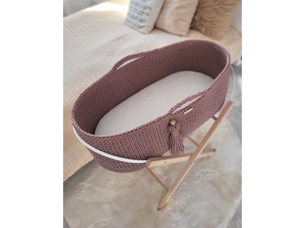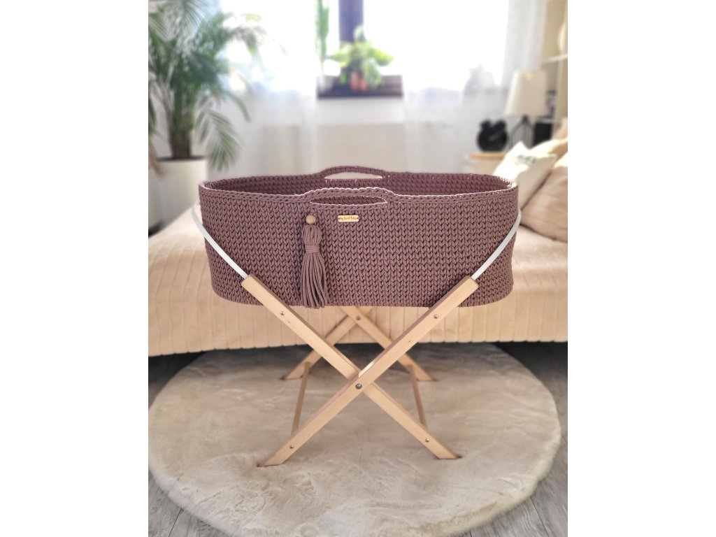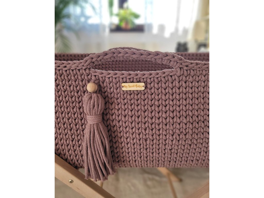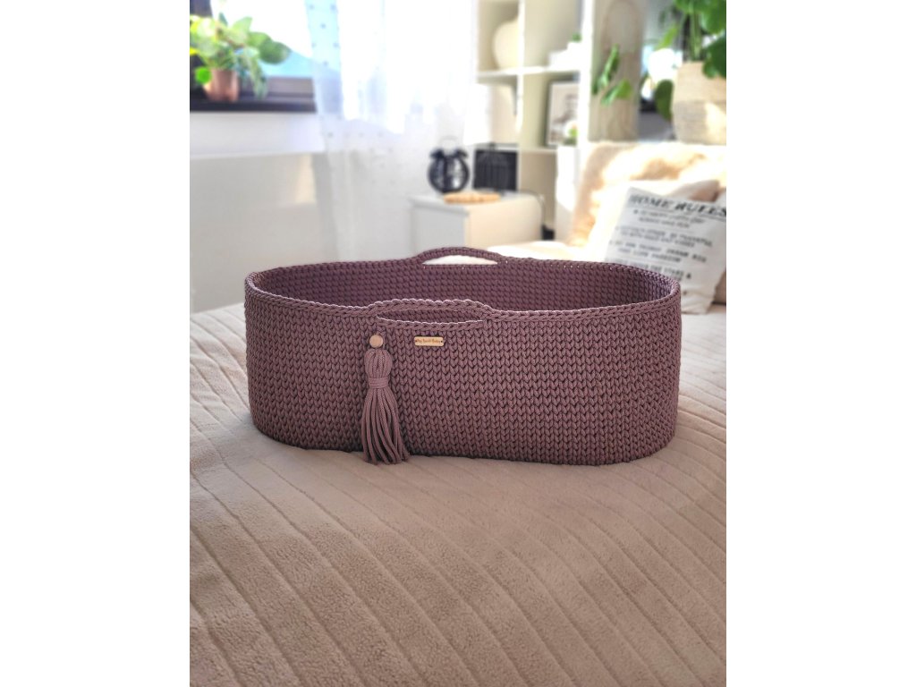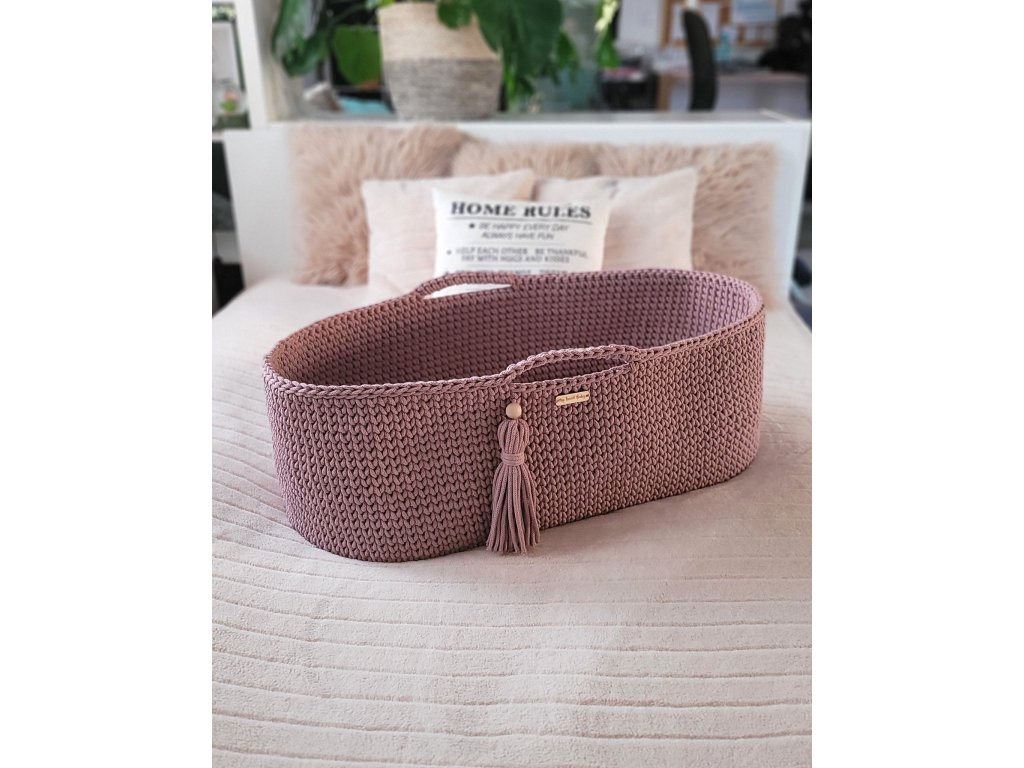Koš je ručně vyrobený z bavlněného provázku. Díky svým malým rozměrům může košík doprovázet rodiče v každé místnosti. Bavlněná šňůra, ze které je košík utkán, je měkká, jemná a zároveň velmi stabilní. Háčkovaný steh použitý v košíku je mírně prolamovaný, díky čemuž je zajištěna správná cirkulace vzduchu. Díky rukojetím lze koš snadno přemisťovat a mít miminko vždy blízko sebe.