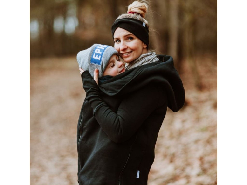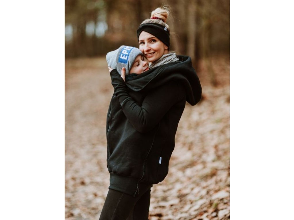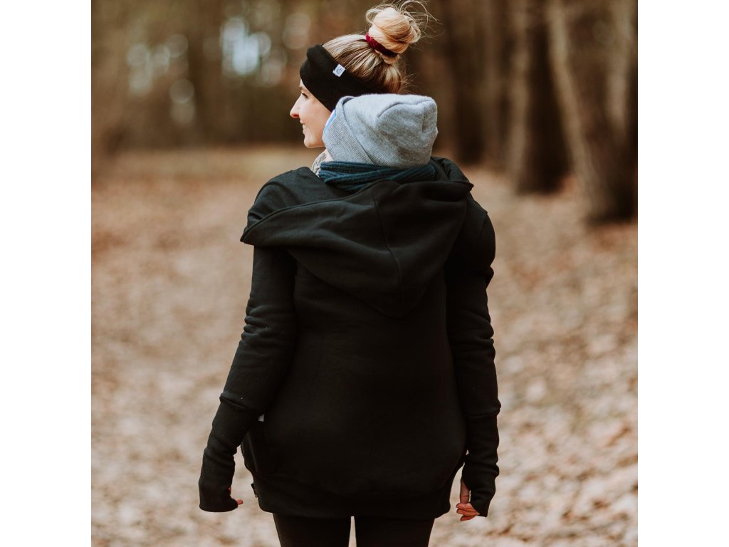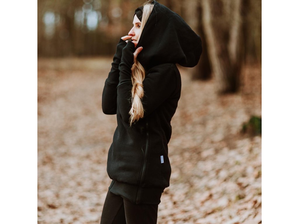 Mikina je zakončena pružnými lemy v pase i na rukávech. Náplety na rukávech mají otvory pro palce. Díky druku, který si zapnete pod krkem už v chladnějších dnech nebudete potřebovat šátek ani šálu (úplně neplatí při nošení děťátka ve předu na těle :) ). Použité zipy jsou od kvalitní a spolehlivé značky YKK.