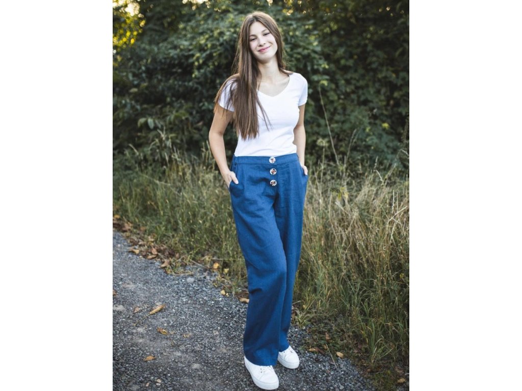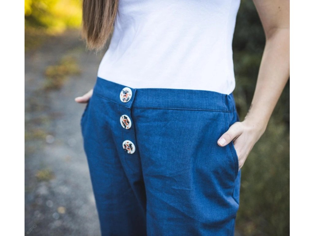 Tyto kalhoty jsou ušité ze směsové tkaniny - lnu a viskózy. Tato směs spojuje pozitivní vlastnosti obou těchto materiálů - látka je měkká, splývavá, tolik se nemačká jako čistá lněná tkanina. Je velmi lehká a vzdušná.