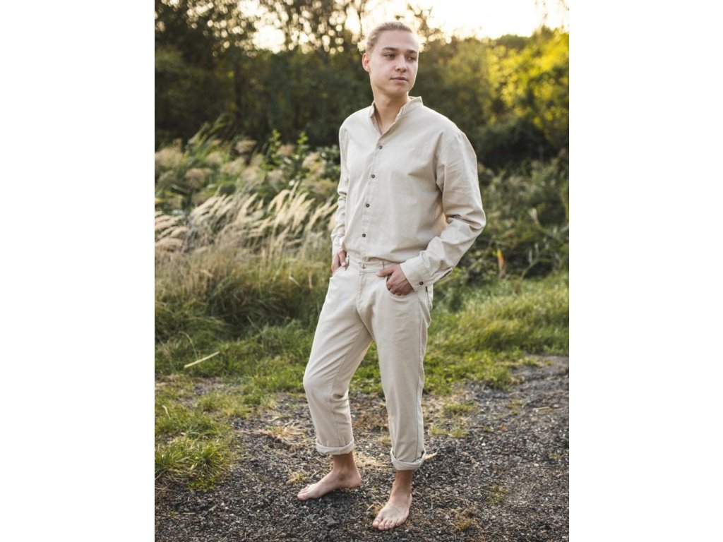 Tyto kalhoty jsou ušité ze směsové tkaniny - lnu a viskózy. Tato směs spojuje pozitivní vlastnosti obou těchto materiálů - látka je měkká, splývavá, tolik se nemačká jako čistá lněná tkanina. Je velmi lehká a vzdušná.