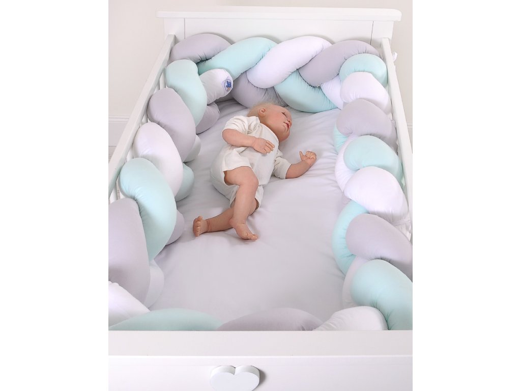 Mantinel upletený do copu dotváří vzhled dětské postýlky.