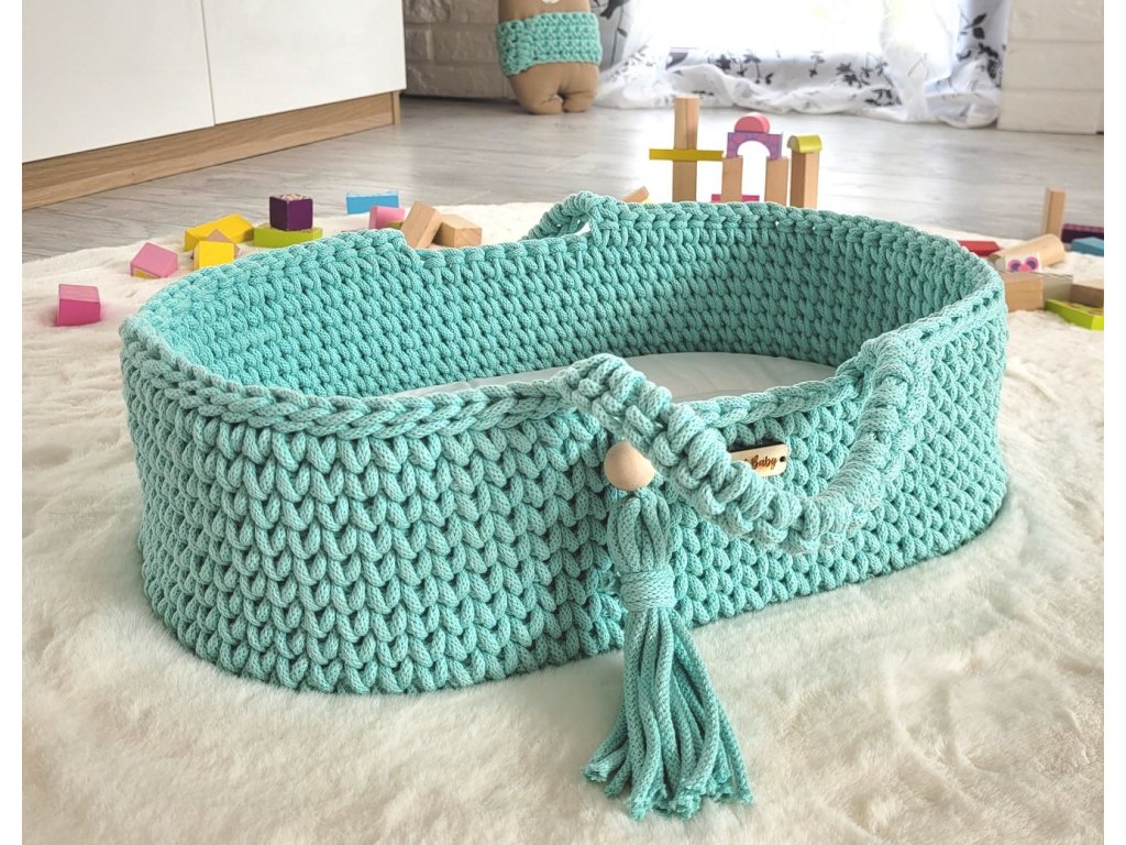 Poznámka - Panenka, peřinky a další dekorativní prvky na fotografiích nejsou součástí sady. Peřinky lze dokoupit zvlášť. Součástí sady je pouze boho koš, matrace a stojan - kolébka.