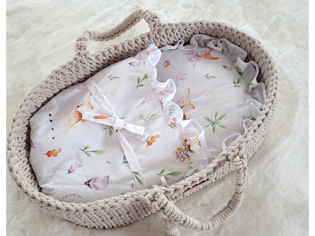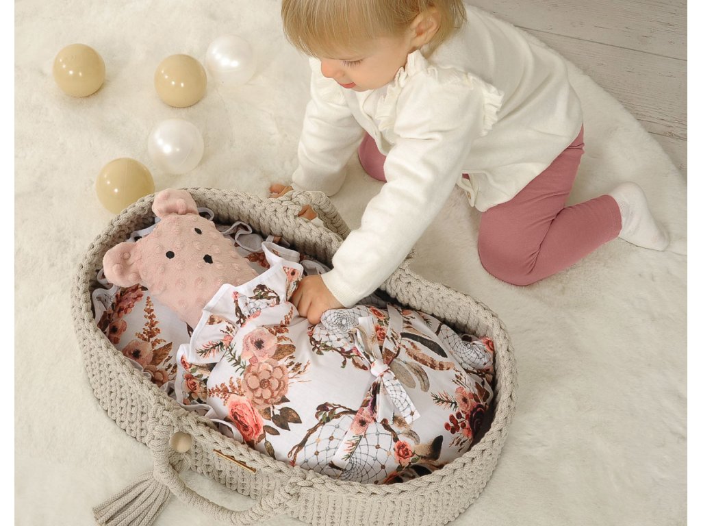 Poznámka - Panenka, peřinky a další dekorativní prvky na fotografiích nejsou součástí sady. Peřinky lze dokoupit zvlášť. Součástí sady je pouze boho koš, matrace a stojan - kolébka.