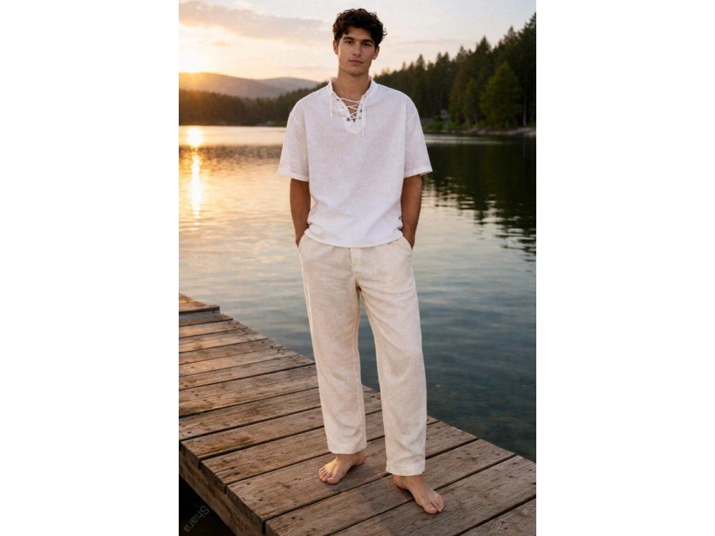 Pánská lněná košile s krátkým rukávem a vázáním - Bílá