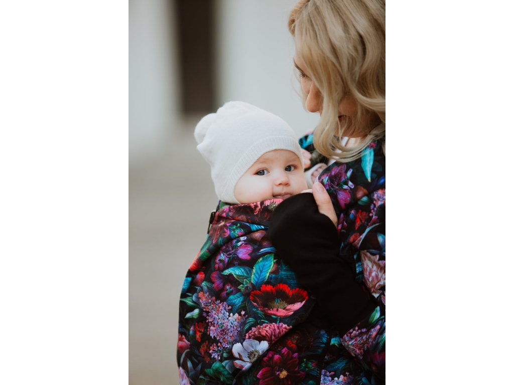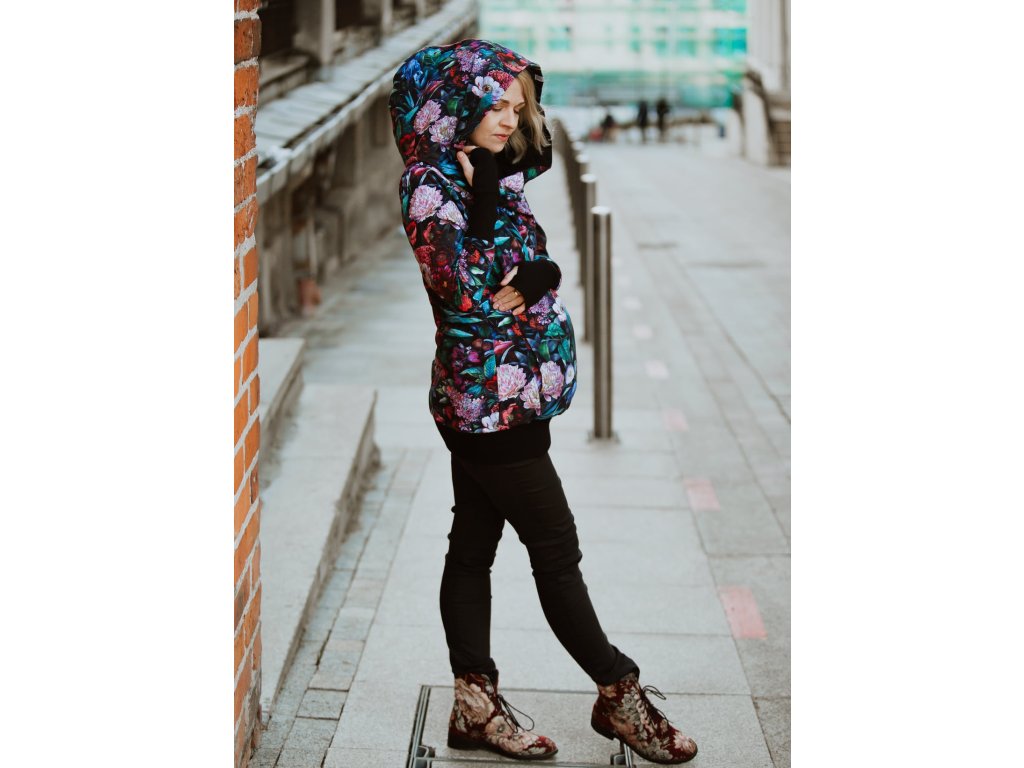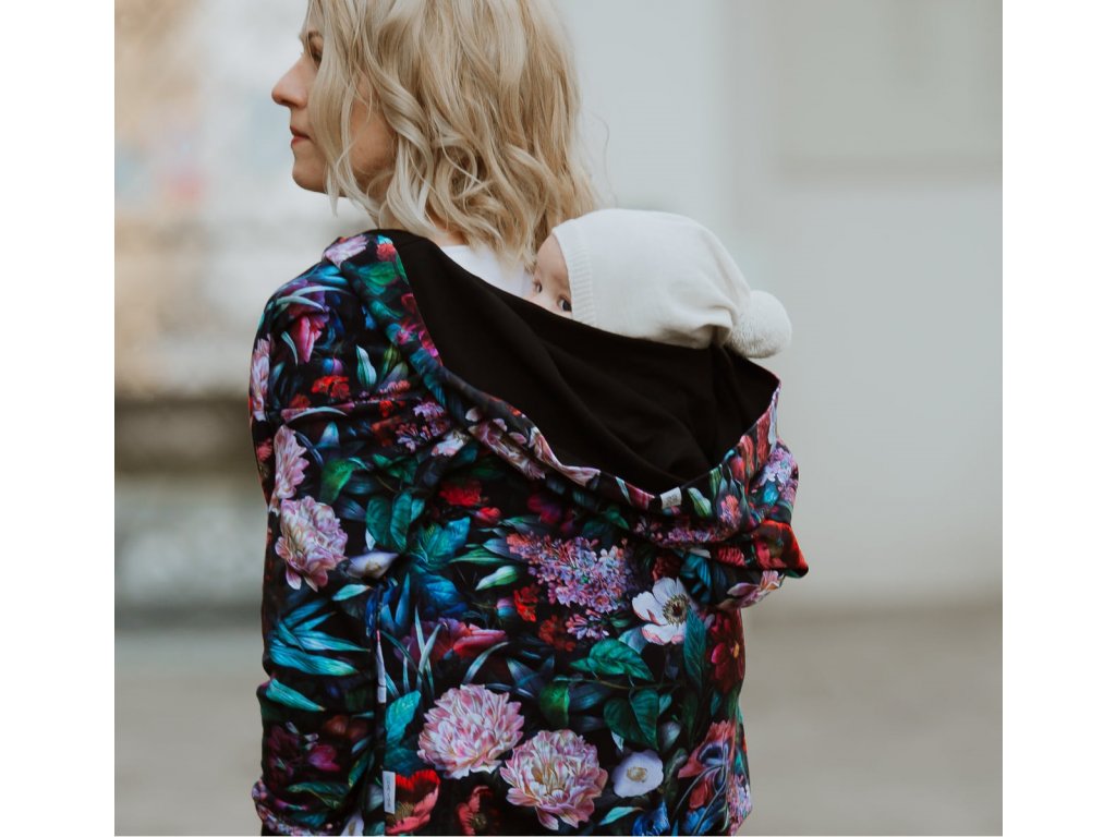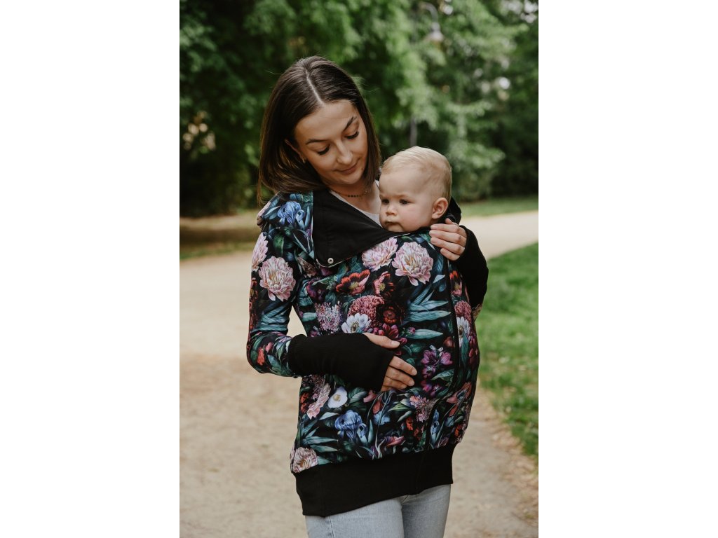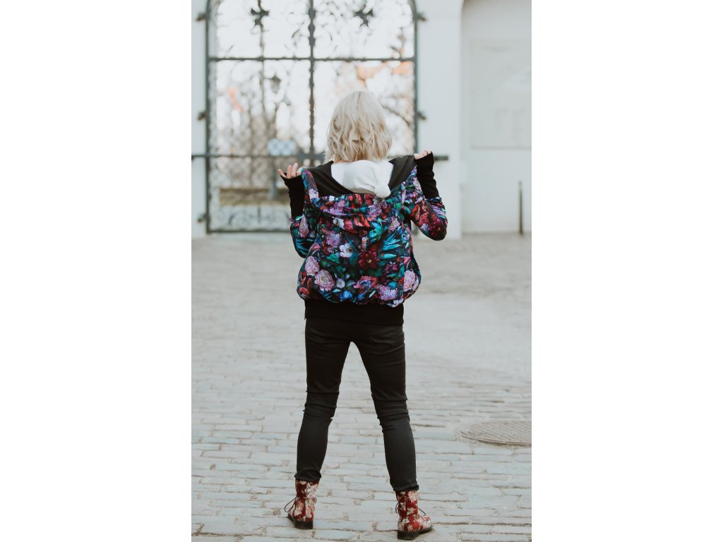 Mikina je zakončena pružnými lemy v pase i na rukávech. Náplety na rukávech mají otvory pro palce. Díky druku, který si zapnete pod krkem už v chladnějších dnech nebudete potřebovat šátek ani šálu (úplně neplatí při nošení děťátka ve předu na těle :) ). Použité zipy jsou od kvalitní a spolehlivé značky YKK.