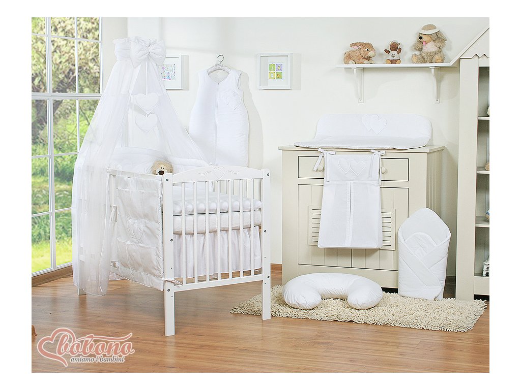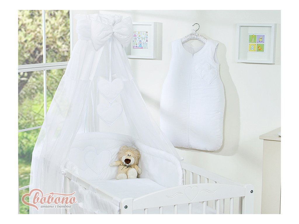 Nebesa jsou doplněná o velkou, tlustou mašli a visící srdíčka, které přitahují pozornost dítěte v prvních měsících a účinně nahrazují kolotoč. Navíc k baldachýnu zdarma dostanete tylovou šerpu, díky které nebesa vypadají ještě elegantněji a jemněji.