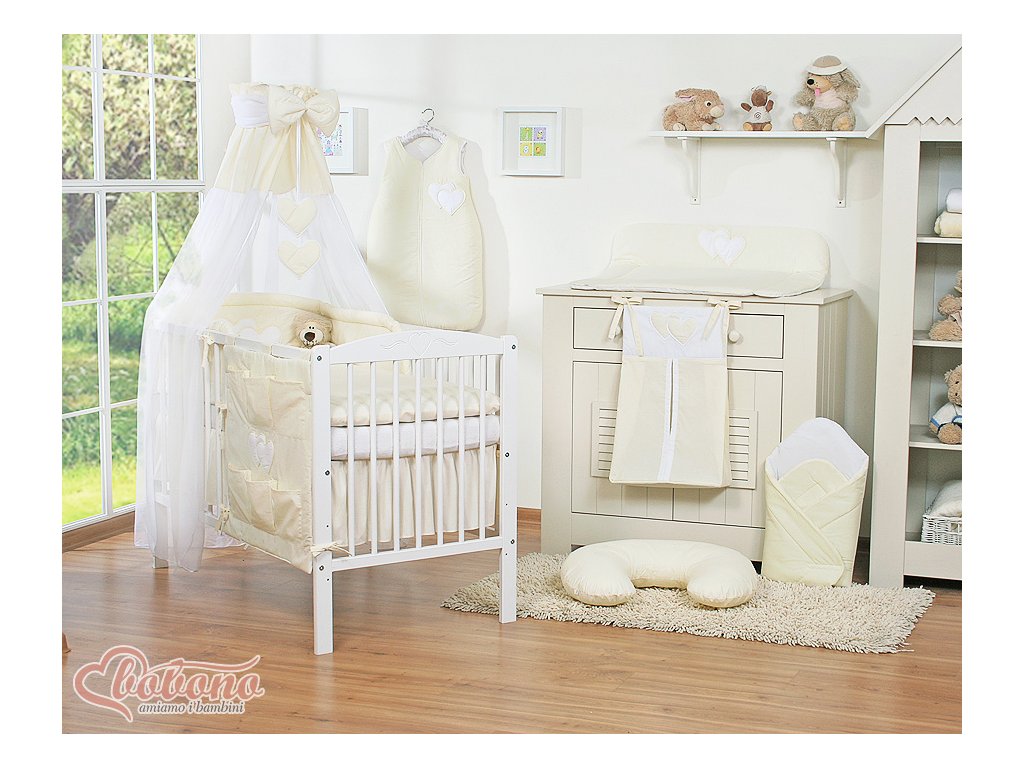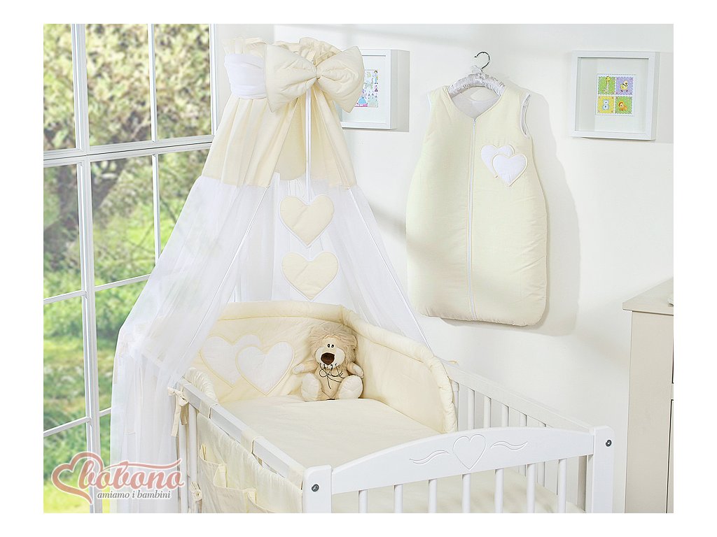 Nebesa jsou doplněná o velkou, tlustou mašli a visící srdíčka, které přitahují pozornost dítěte v prvních měsících a účinně nahrazují kolotoč. Navíc k baldachýnu zdarma dostanete tylovou šerpu, díky které nebesa vypadají ještě elegantněji a jemněji.
