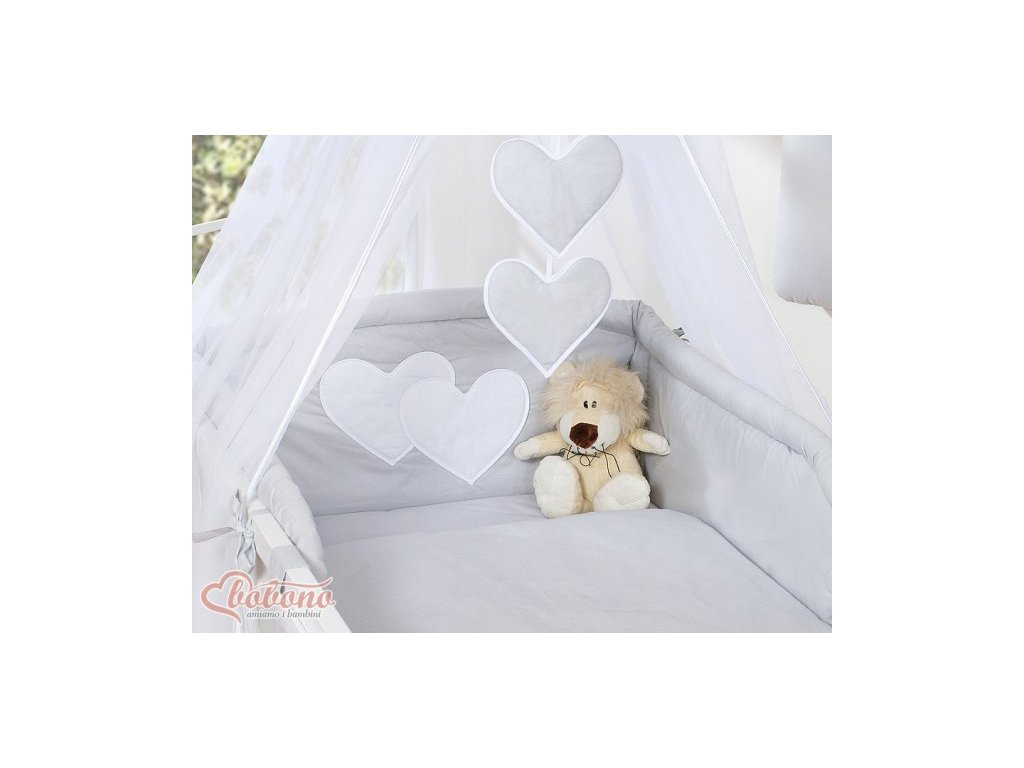 Nebesa jsou doplněná o velkou, tlustou mašli a visící srdíčka, které přitahují pozornost dítěte v prvních měsících a účinně nahrazují kolotoč. Navíc k baldachýnu zdarma dostanete tylovou šerpu, díky které nebesa vypadají ještě elegantněji a jemněji.