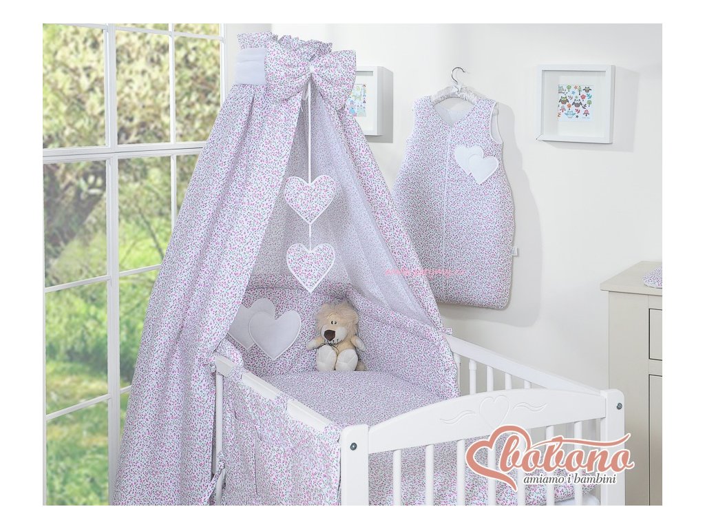 Nebesa jsou doplněná o velkou, tlustou mašli a visící srdíčka, které přitahují pozornost dítěte v prvních měsících a účinně nahrazují kolotoč. Navíc k baldachýnu zdarma dostanete tylovou šerpu, díky které nebesa vypadají ještě elegantněji a jemněji.