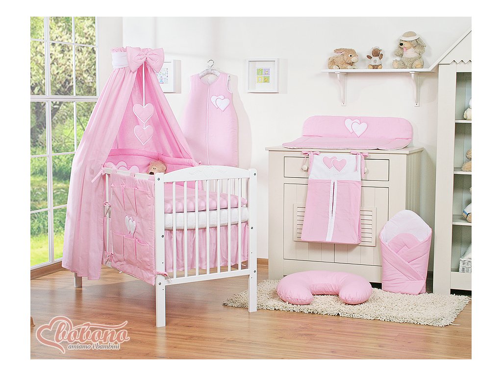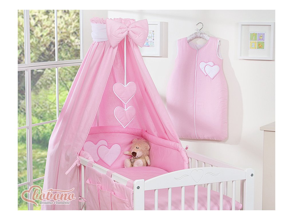 Nebesa jsou doplněná o velkou, tlustou mašli a visící srdíčka, které přitahují pozornost dítěte v prvních měsících a účinně nahrazují kolotoč. Navíc k baldachýnu zdarma dostanete tylovou šerpu, díky které nebesa vypadají ještě elegantněji a jemněji.