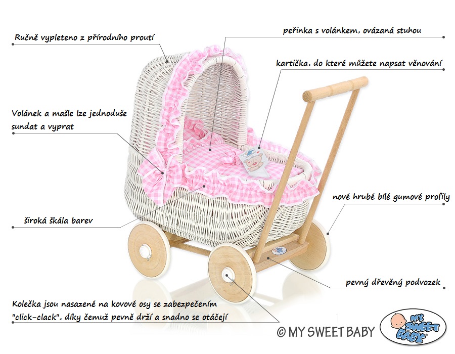 Nadčasové kočárky pro panenky, medvídky a jiné plyšáky. 100% ruční práce, vyrobené v nejvyšší kvalitě, z přírodních materiálů, natřené ekologickými barvami, které jsou určené na hračky pro děti. Polštářky, peřinky a obšití jsou ze 100% bavlny.