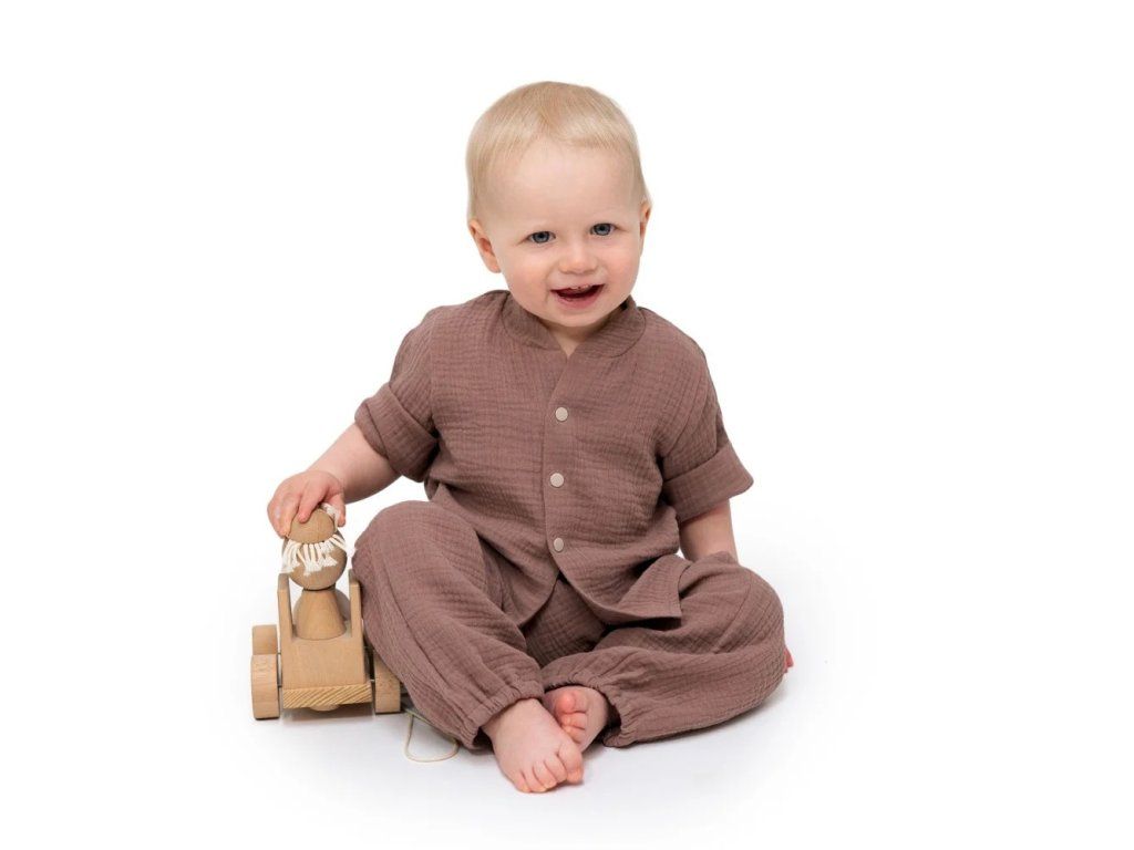 Mušelínové kalhoty, zajišťující naprosté pohodlí, žádné pocení i během horkých letních dnů. Kalhoty jsou tak jemné, že se v nich dítě cítí jako by bylo zahaleno v obláčku a zároveň je chráněno před horkými paprsky