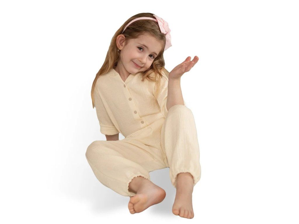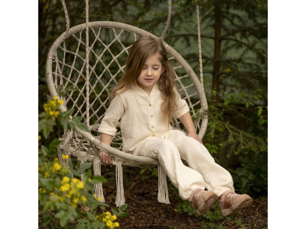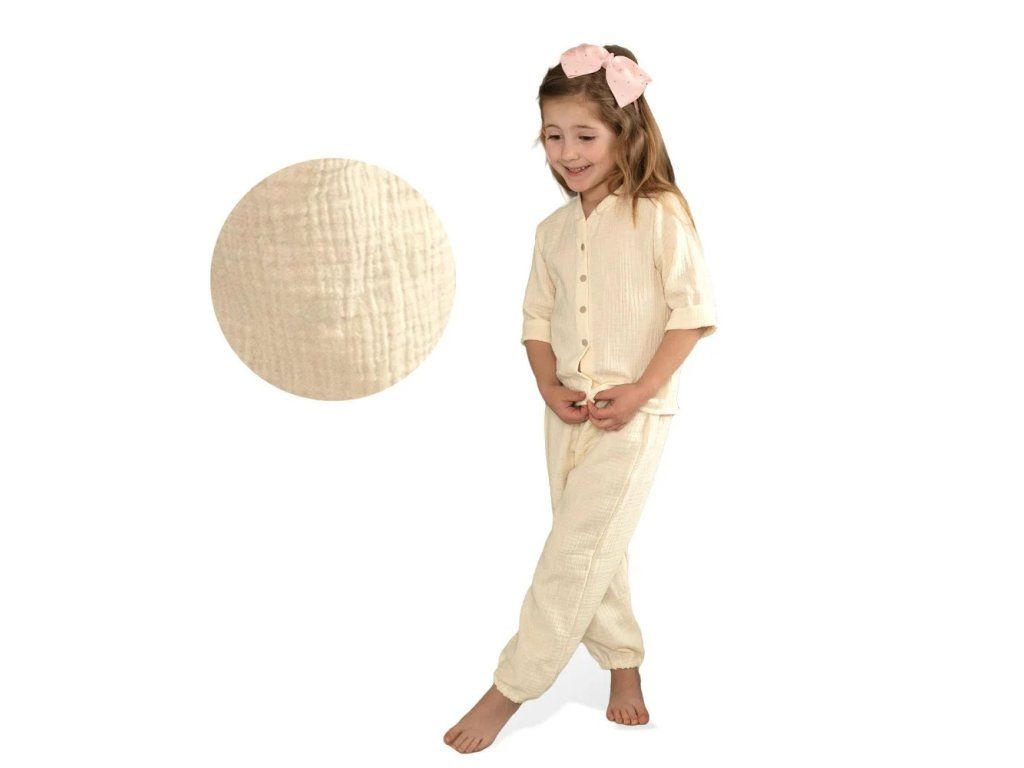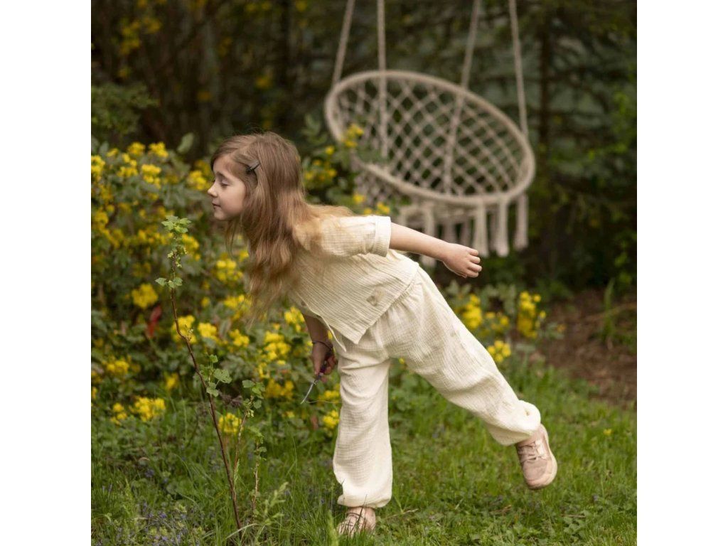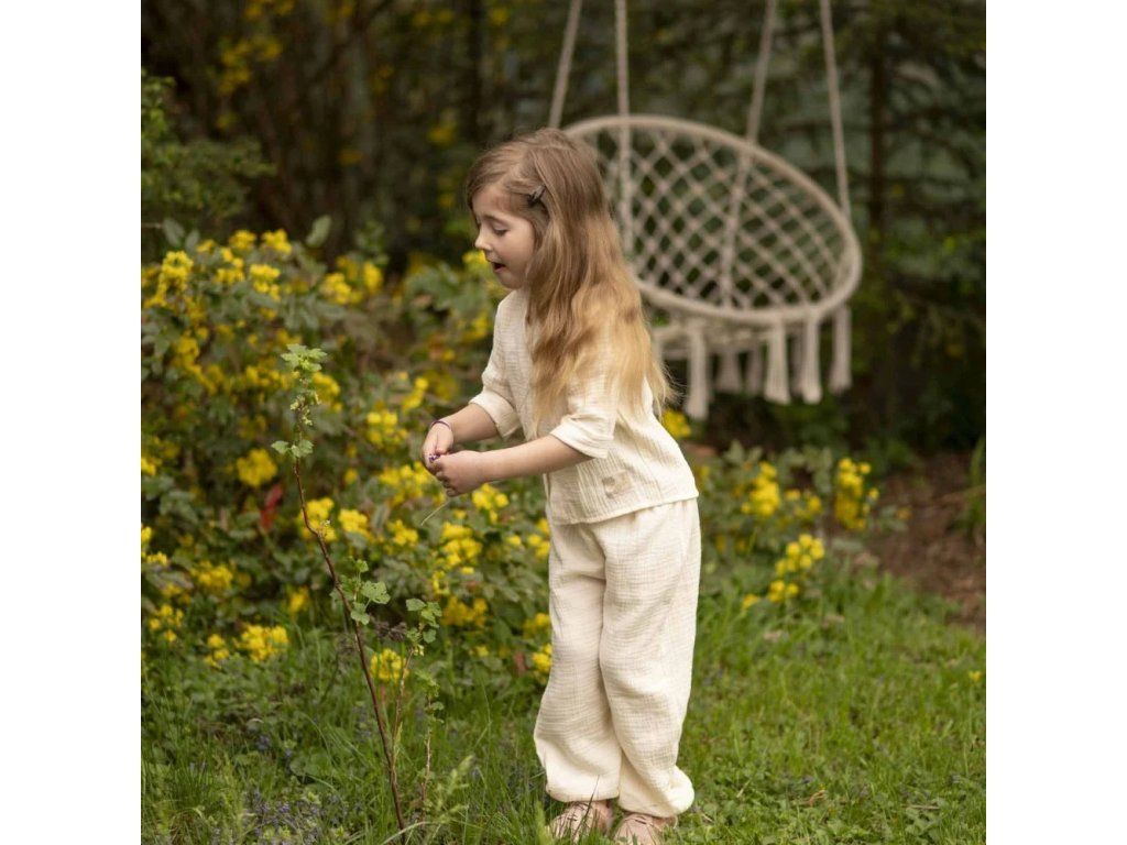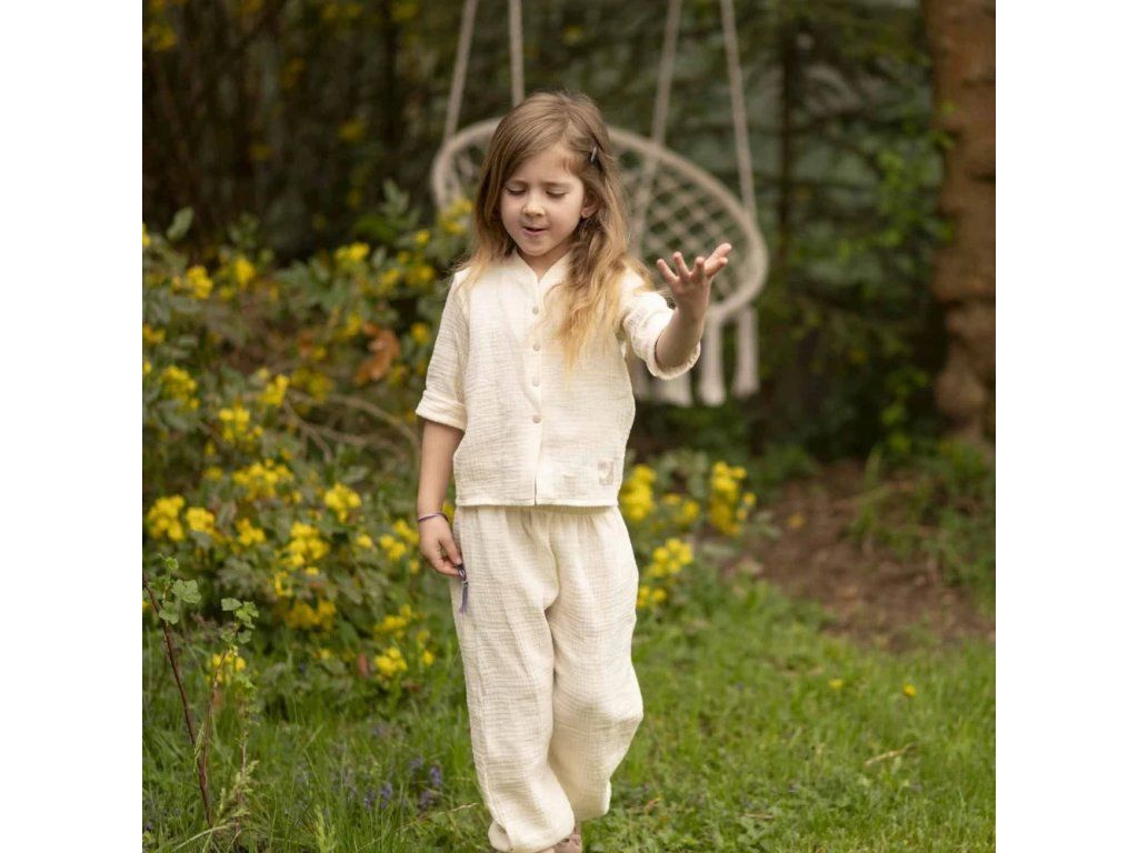 Mušelínové kalhoty, zajišťující naprosté pohodlí, žádné pocení i během horkých letních dnů. Kalhoty jsou tak jemné, že se v nich dítě cítí jako by bylo zahaleno v obláčku a zároveň je chráněno před horkými paprsky