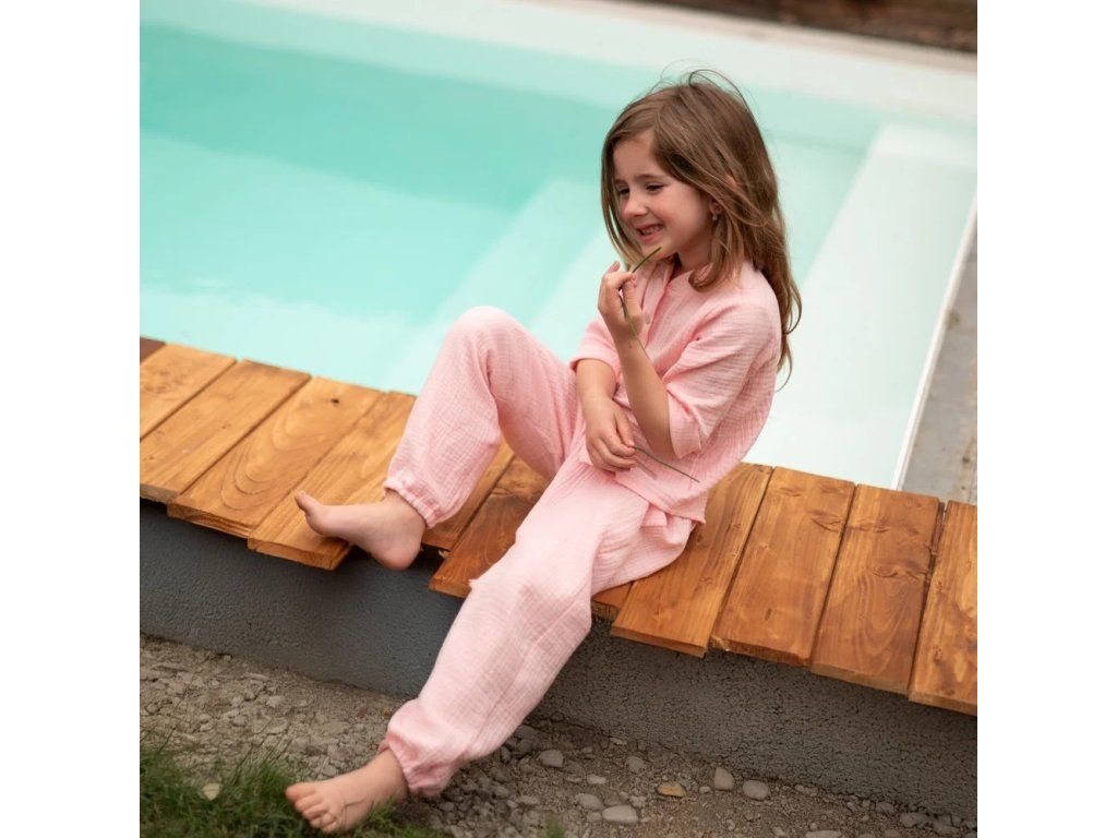 Mušelínové kalhoty, zajišťující naprosté pohodlí, žádné pocení i během horkých letních dnů. Kalhoty jsou tak jemné, že se v nich dítě cítí jako by bylo zahaleno v obláčku a zároveň je chráněno před horkými paprsky