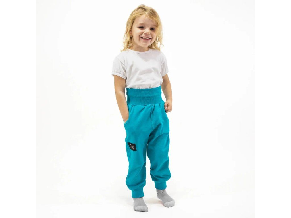 Rostoucí, bavlněné a navíc pružné tepláky osvědčeného střihu, s vysokým bavlněným nápletem v pase.