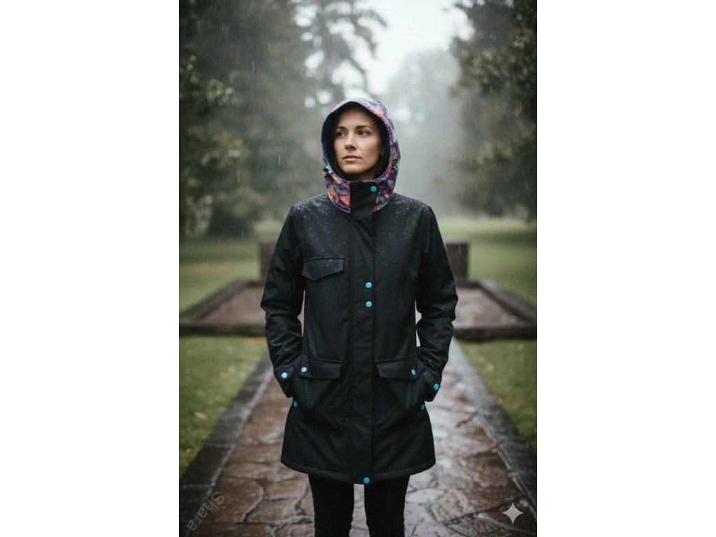 Softshellový kabát dámský - Černá + mandalové trojúhelníky/petrolejová