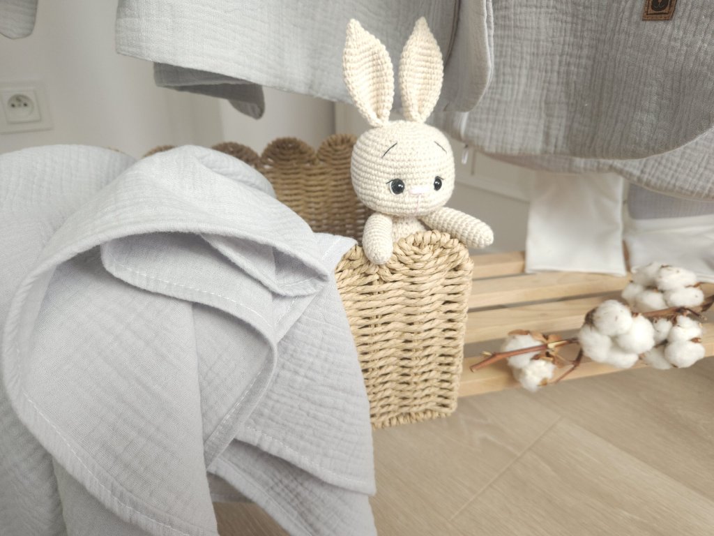 Vyrobené z prvotřídního mušelínu, který se vyznačuje neuvěřitelnou měkkostí a jemností, je velmi příjemný na dotek a působí proti podráždění a alergiím. Je vhodný pro citlivou dětskou pokožku.