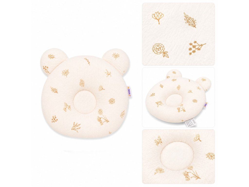 Profilované vybrání ve středu polštáře napomáhá předcházet zploštění zadní části hlavičky a podporuje její přirozený tvar. Polštářek je vhodný do postýlky, kočárku i hnízdečka.