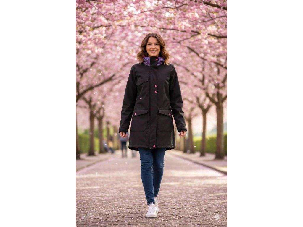 Nosící softshellový kabát s hladícími kapsami - Černá + malované květy/růžová