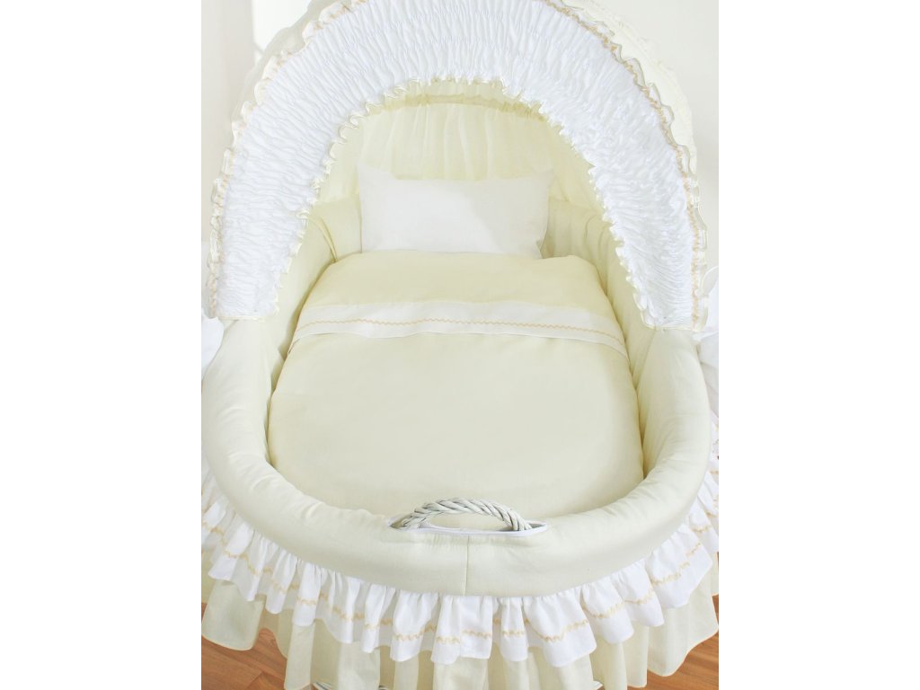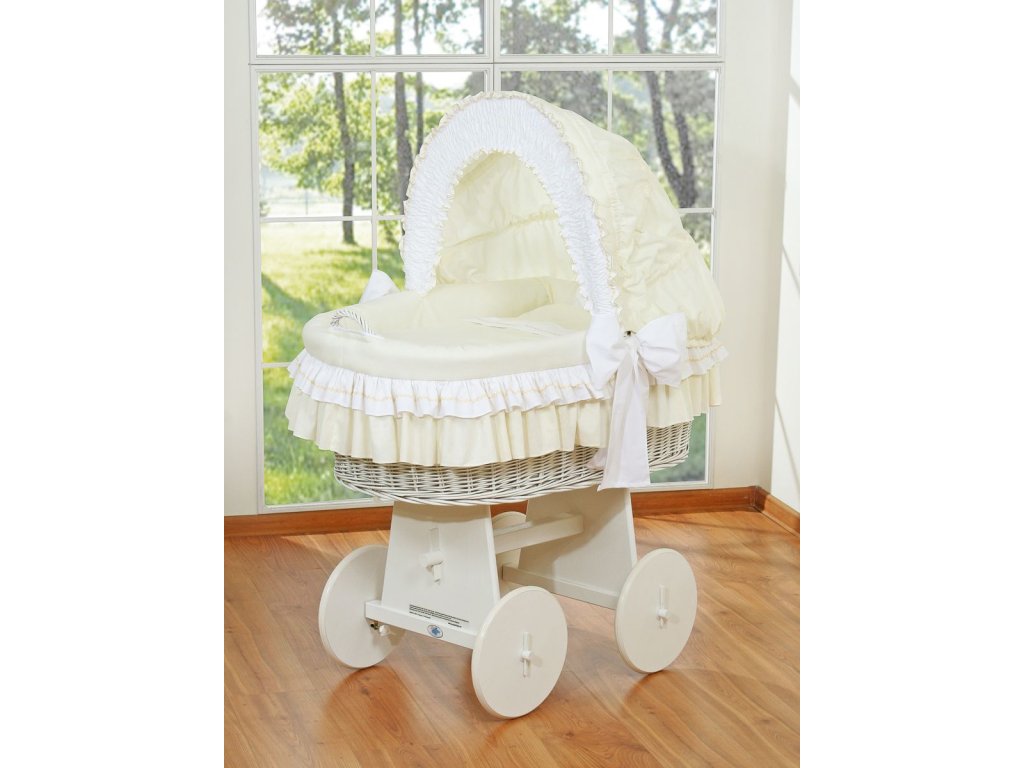 Krásný, ručně pletený proutěný mojžíšův koš na stabilním dřevěném podvozku - perfektní postýlka pro novorozence a kojence do věku 6-9 měsíců