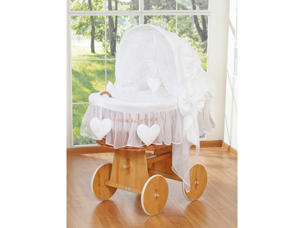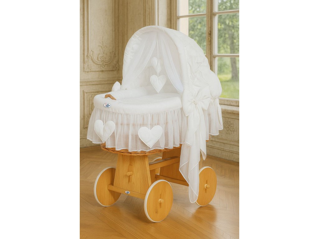 Krásný, ručně pletený proutěný mojžíšův koš na stabilním dřevěném podvozku - perfektní postýlka pro novorozence a kojence do věku 6-9 měsíců