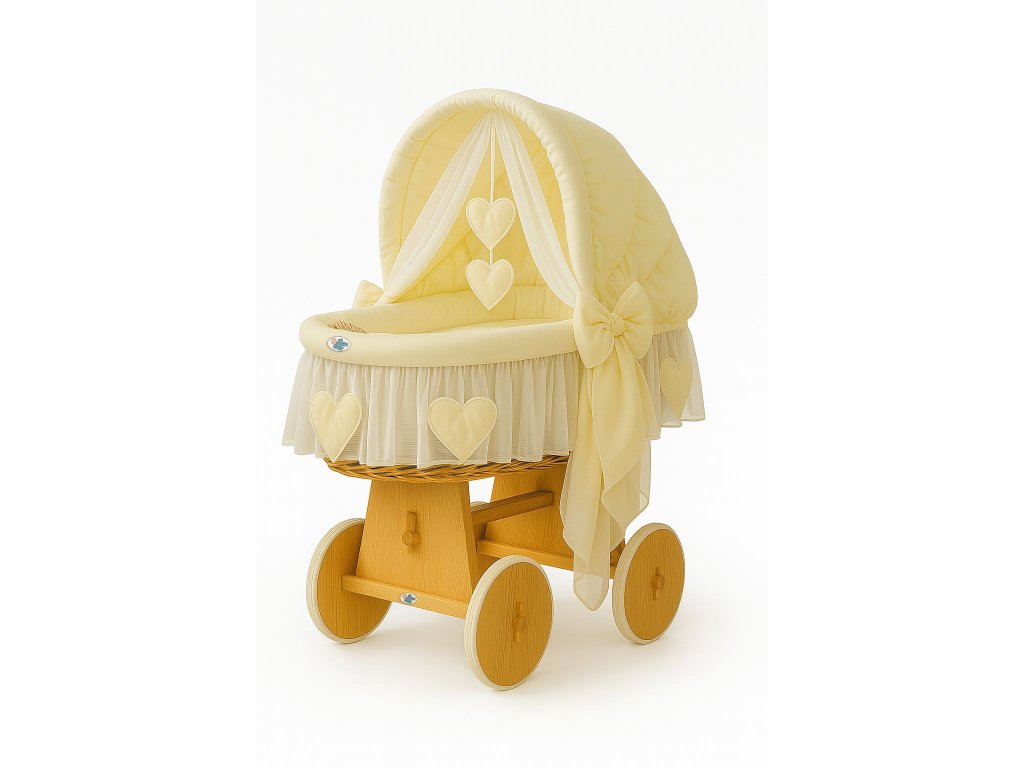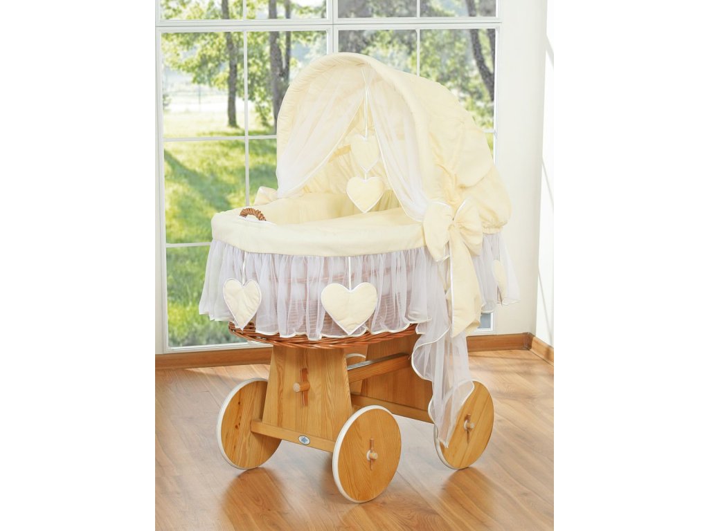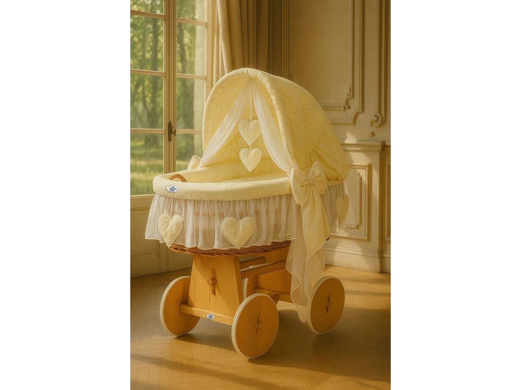 Krásný, ručně pletený proutěný mojžíšův koš na stabilním dřevěném podvozku - perfektní postýlka pro novorozence a kojence do věku 6-9 měsíců