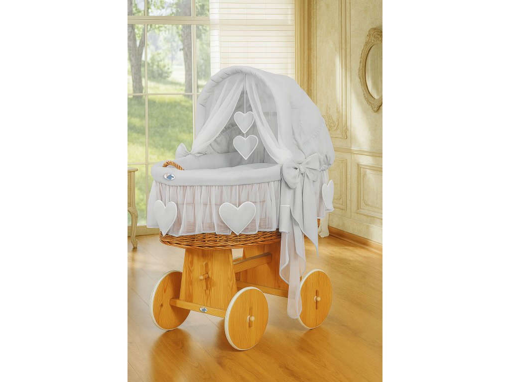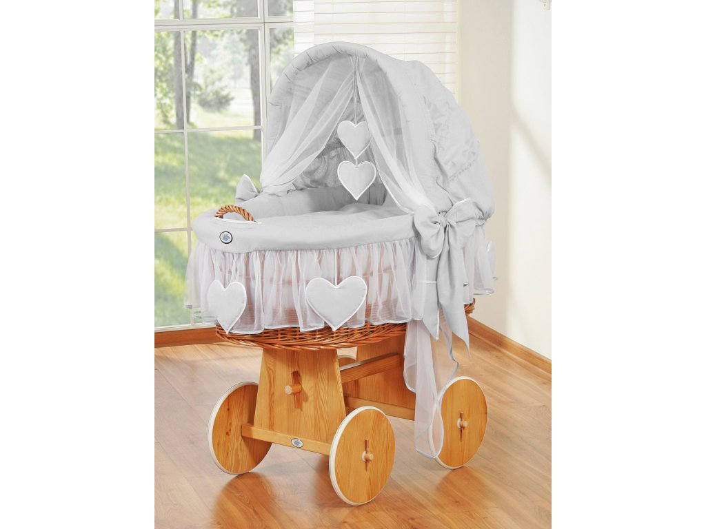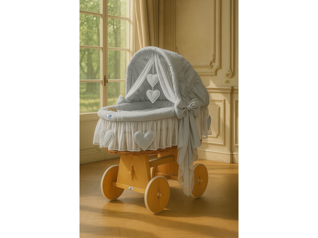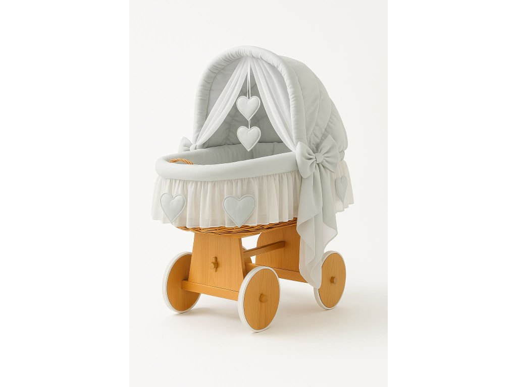 Krásný, ručně pletený proutěný mojžíšův koš na stabilním dřevěném podvozku - perfektní postýlka pro novorozence a kojence do věku 6-9 měsíců