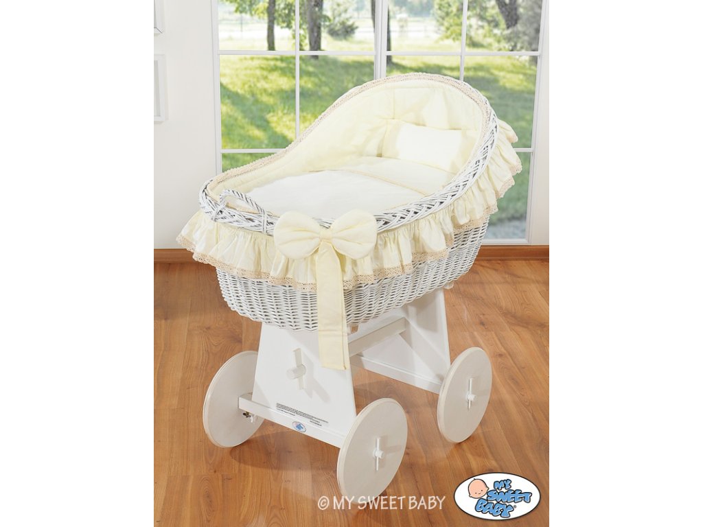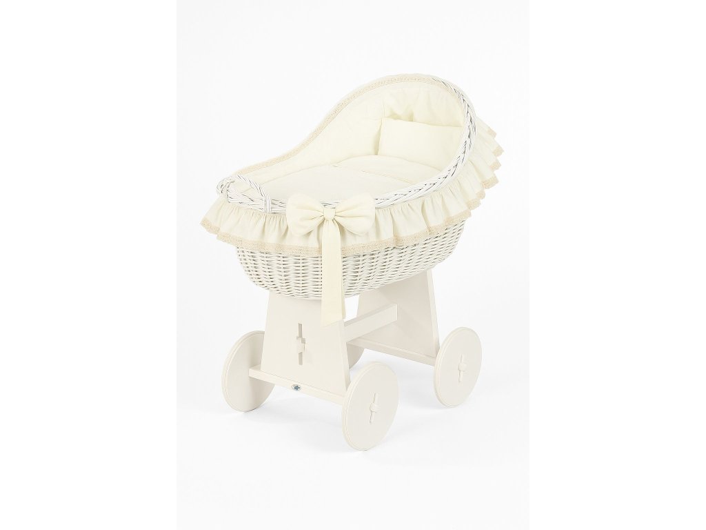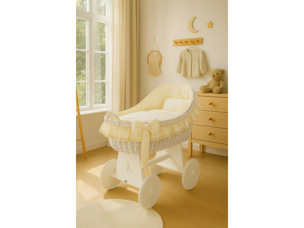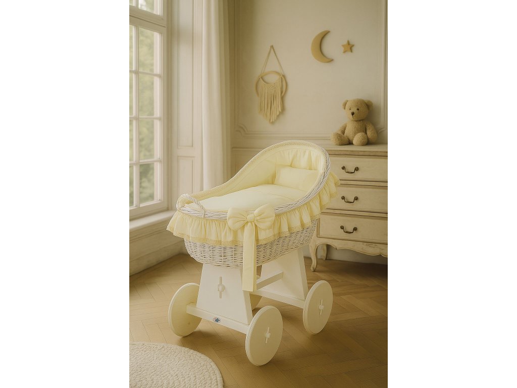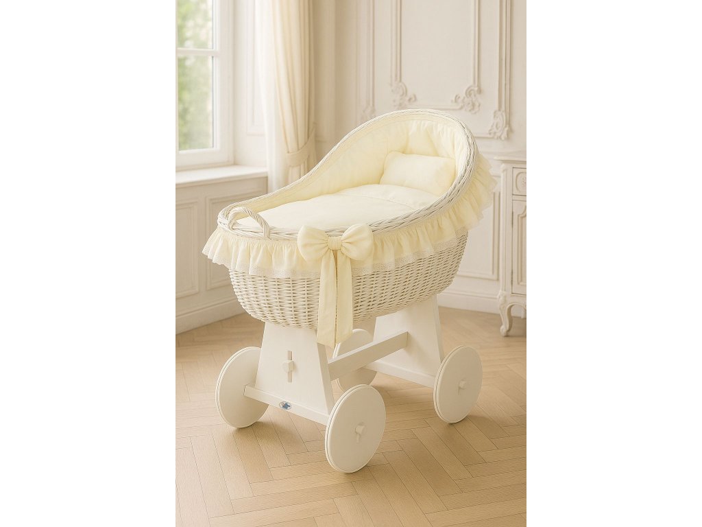 Krásný, ručně pletený proutěný mojžíšův koš na stabilním dřevěném podvozku - perfektní postýlka pro novorozence a kojence do věku 6-9 měsíců
