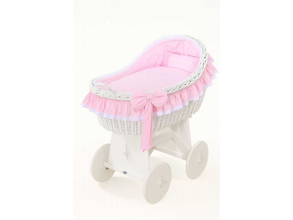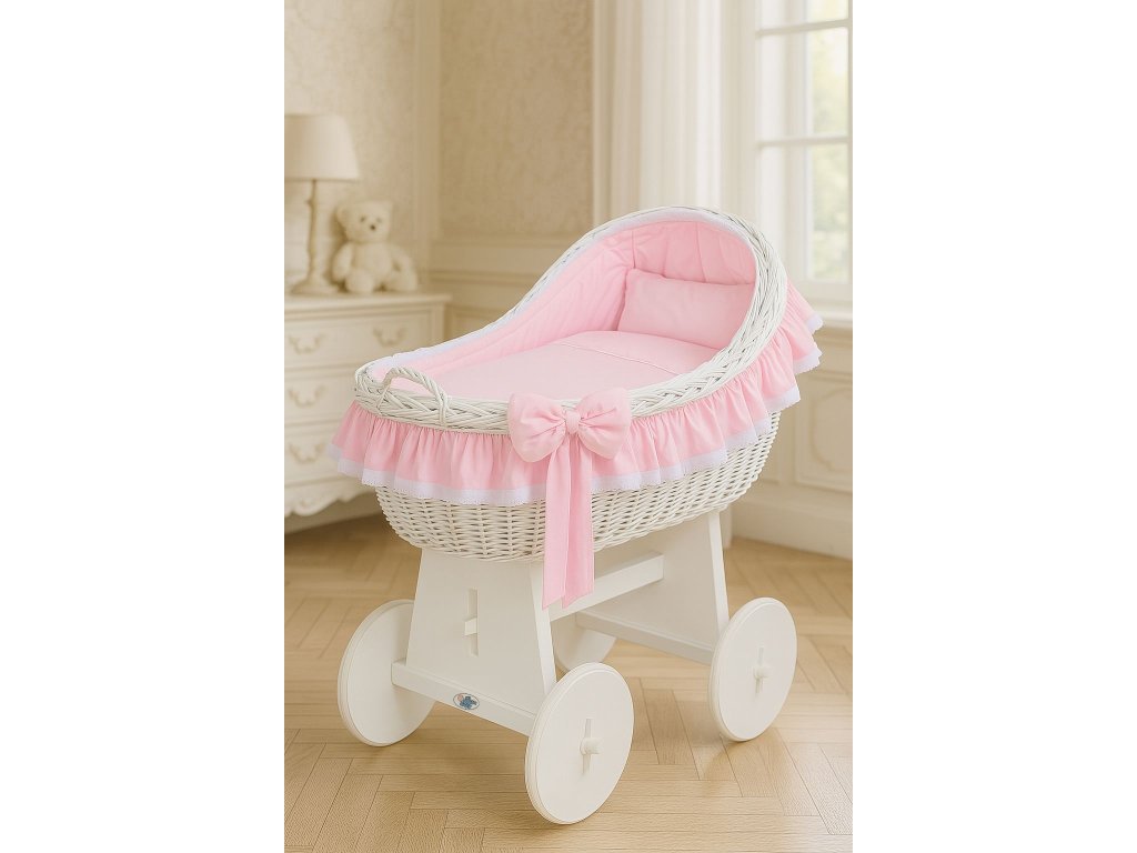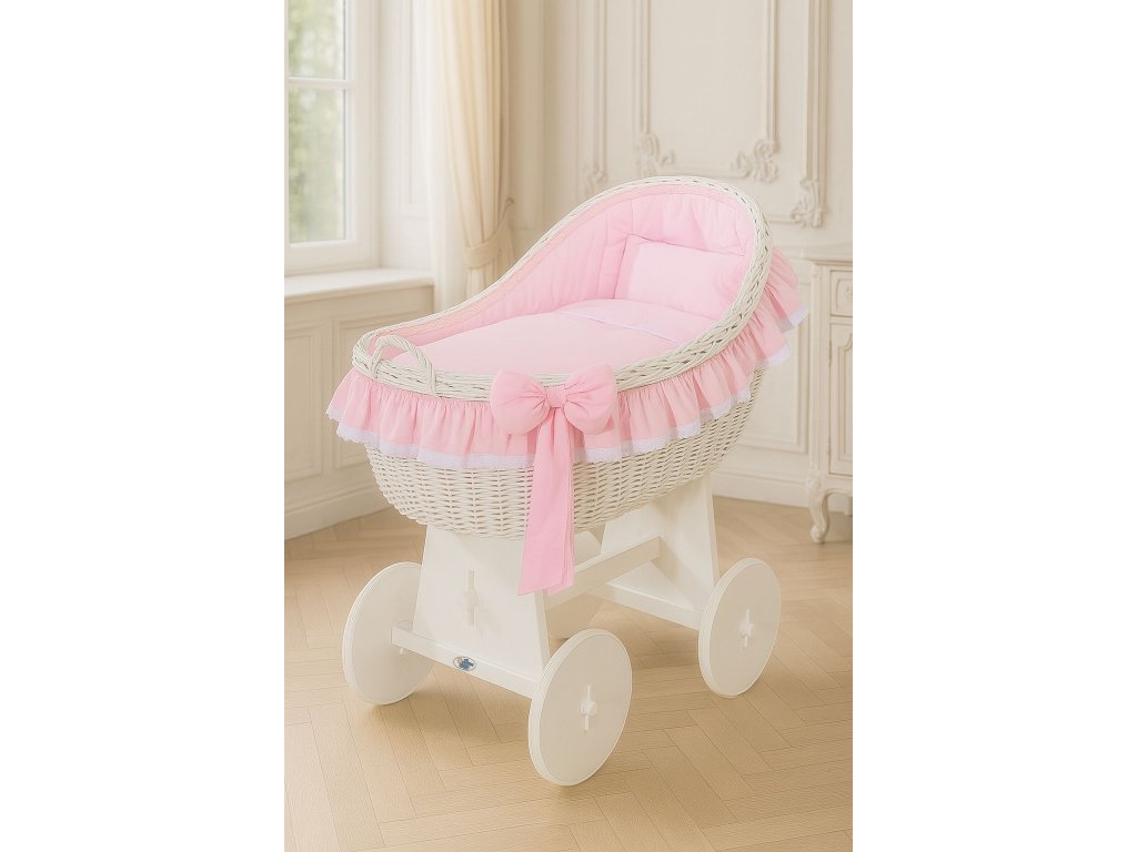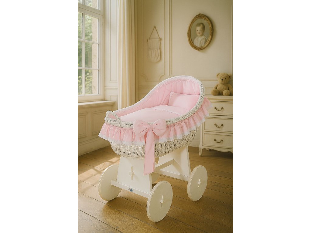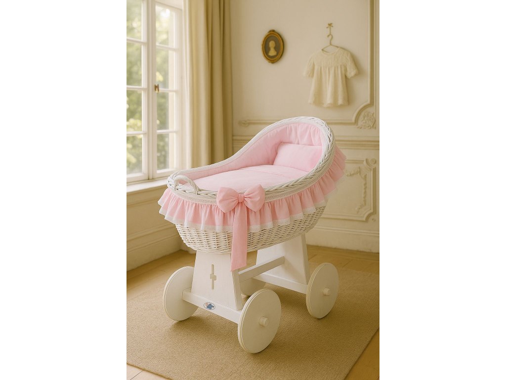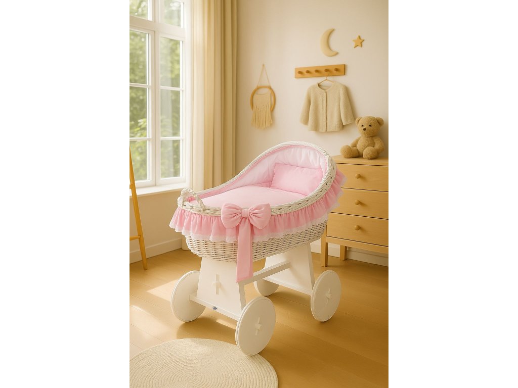 Krásný, ručně pletený proutěný mojžíšův koš na stabilním dřevěném podvozku - perfektní postýlka pro novorozence a kojence do věku 6-9 měsíců