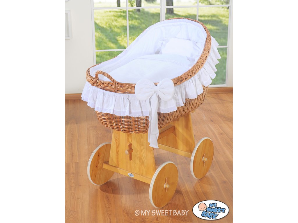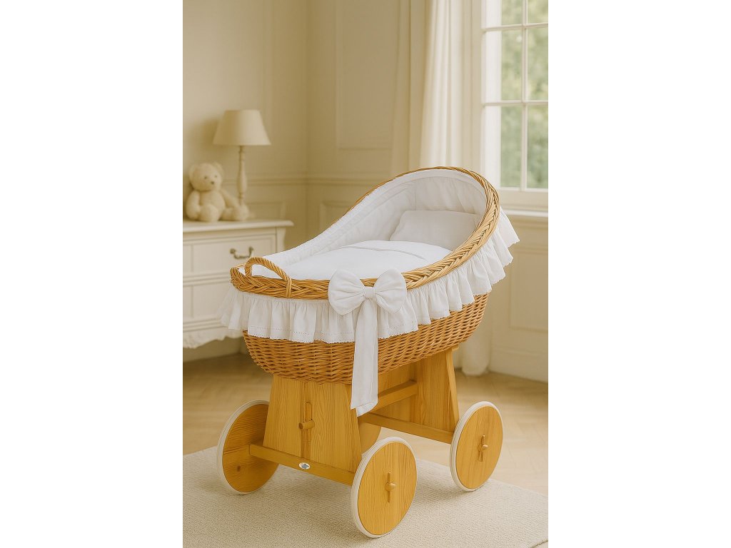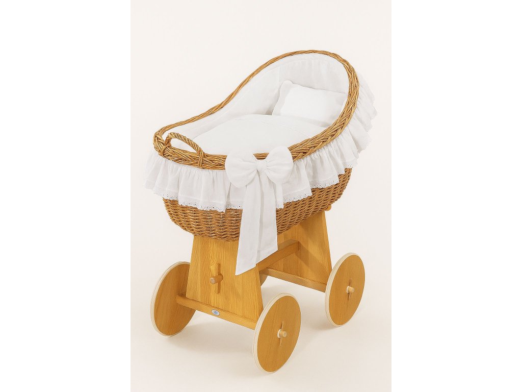 Krásný, ručně pletený proutěný mojžíšův koš na stabilním dřevěném podvozku - perfektní postýlka pro novorozence a kojence do věku 6-9 měsíců