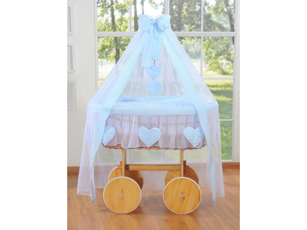 Krásný, ručně pletený proutěný mojžíšův koš na stabilním dřevěném podvozku - perfektní postýlka pro novorozence a kojence do věku 6-9 měsíců
