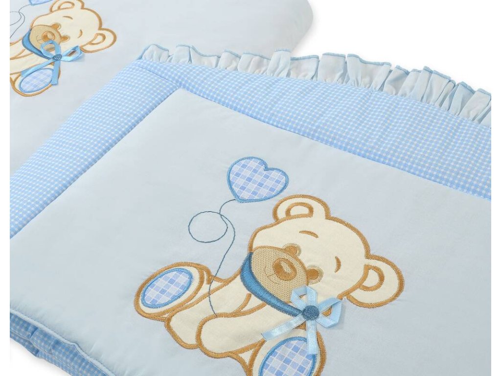 Výšivka Medvídka se srdcem a mašlí je na mantinelu a povlaku na peřinku