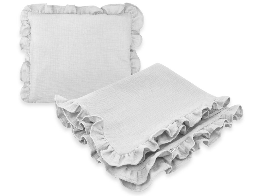 Tato sada zahrnuje měkoučkou deku s volánkem a polštářek s povlakem na zip. Obojí vyrobené z prvotřídního bavlněného mušelínu, dvojitá gáza