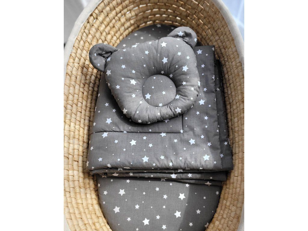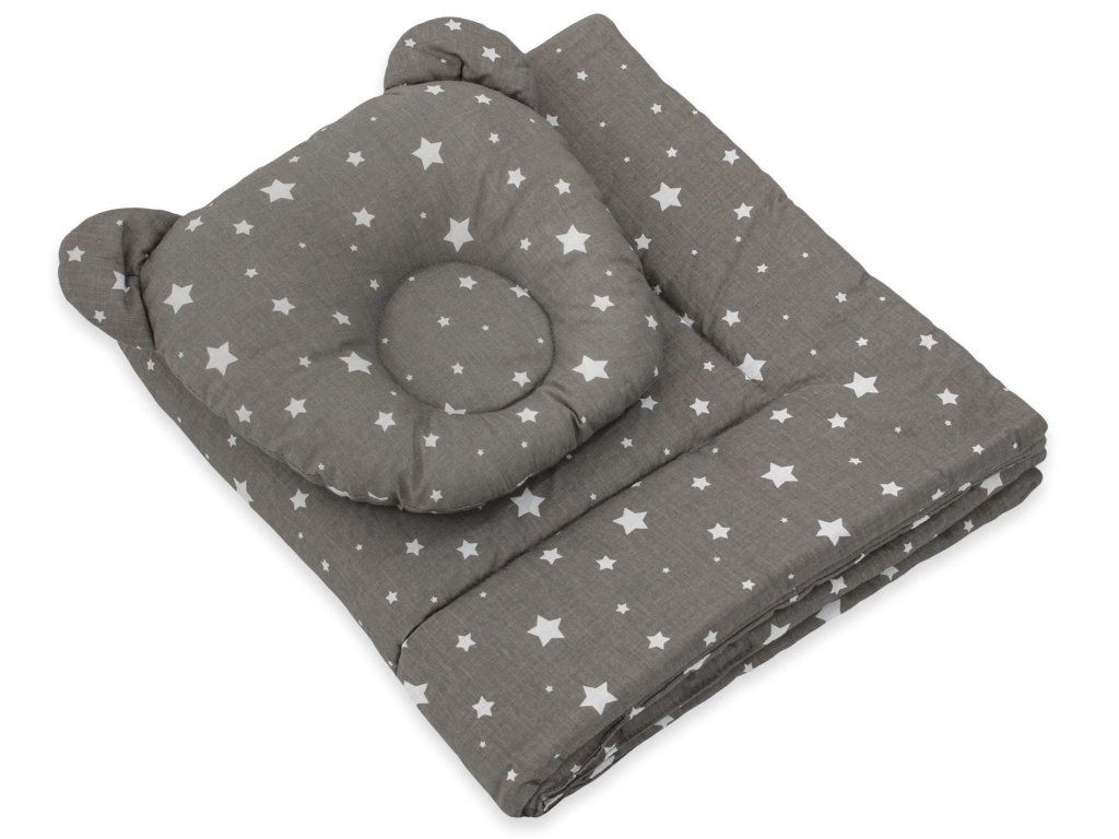 Polštářek s prohlubní, zabraňující zploštění hlavy miminka. Je vyplněn certifikovanou silikonovou netkanou textilií, která je měkká a vzdušná, se speciálně zvolenou gramáží, aby polštář nebyl příliš tlustý a zároveň zajišťoval optimální měkkost a pružnost. Povlak je pevně přišitý, nelze sundat.