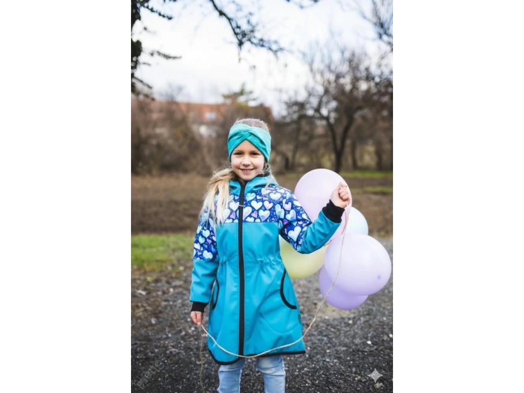 Dívčí softshellový kabát s guičkou v pase - Petrolejová, srdíčka