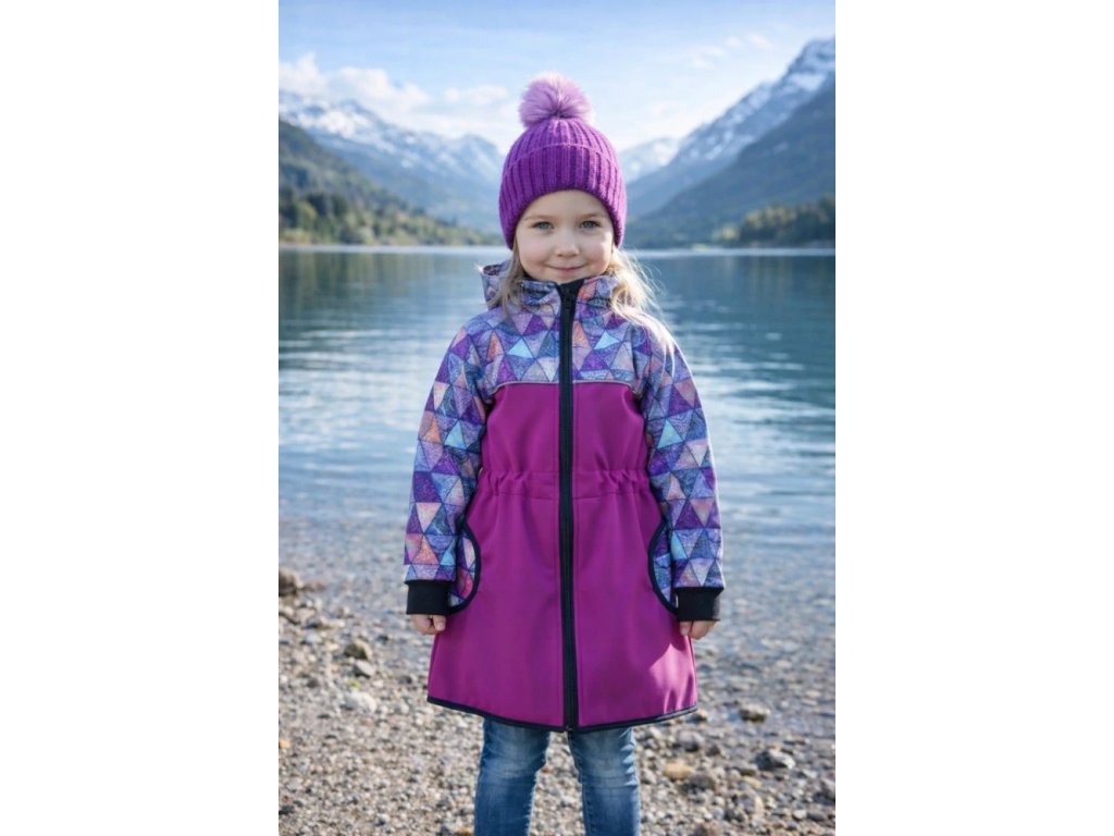 Dívčí softshellový kabát s gumičkou v pase - Fuchsie/mandalové trojúhelníky