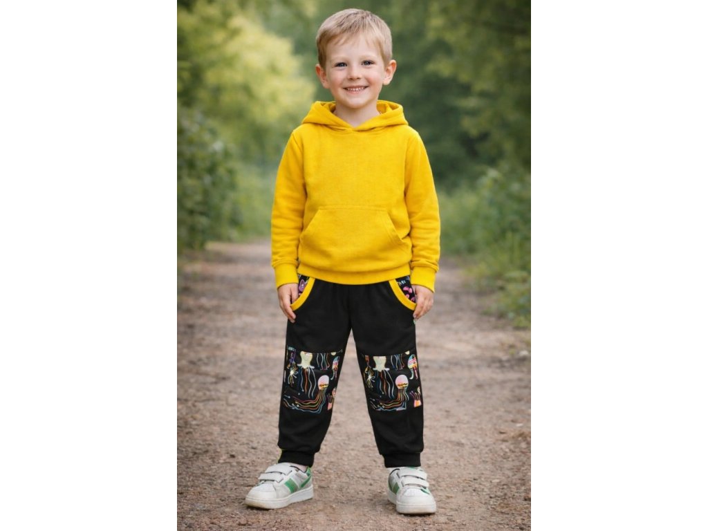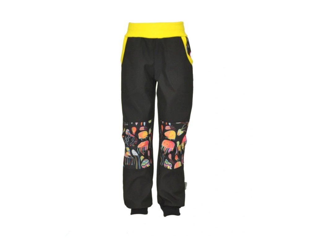 Dětské kalhoty softshellové - Černá + medúzy/žlutá v pase