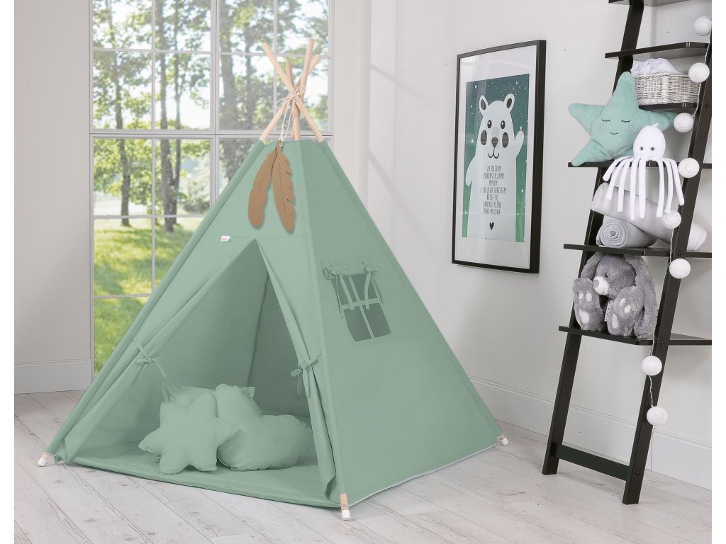 Stan teepee je vyroben z certifikované bavlny a přírodních borovicových tyčí, což zaručuje bezpečnost používání. Stan - látku lze z tyčí jednoduše sundat a vyprat v pračce.