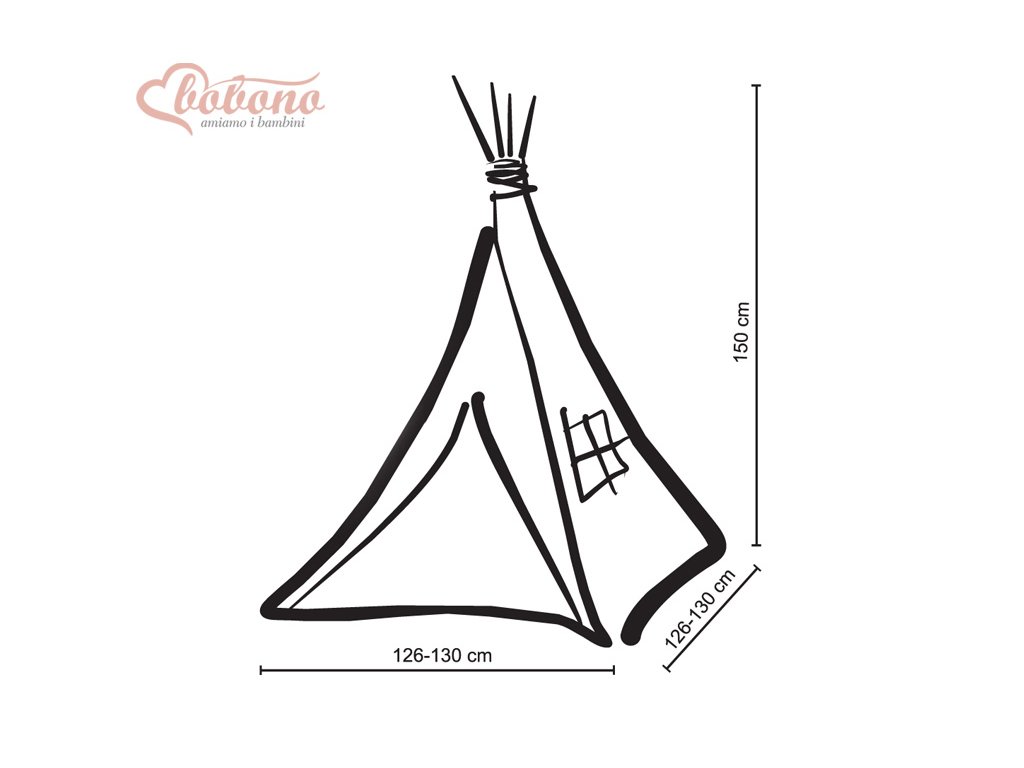 Celková výška Teepee je 150 cm a ve spodní části má dítě velmi velký prostor (průměr spodní části je cca 130 cm). V boční části je okénko se závěsem a i u vchodu do stanu jsou popruhy, které lze uvázat, aby dítě mělo volný průchod do teepee i ven. Když jsou závěsy spuštěny, může být stan dokonalým úkrytem při hraní.
