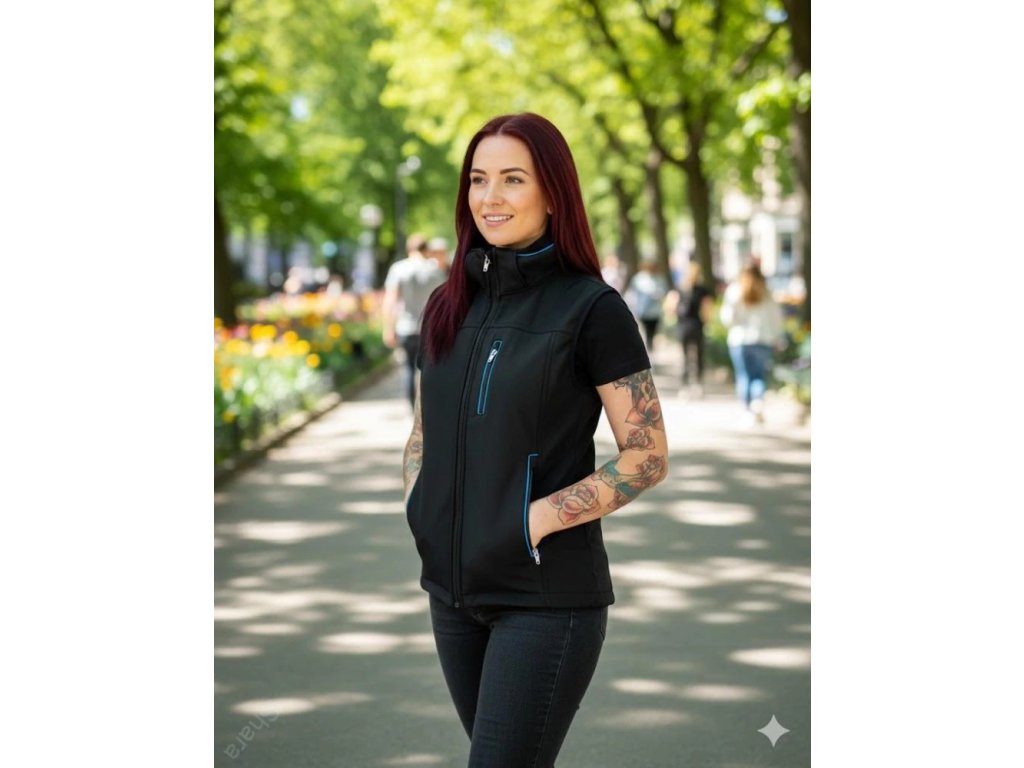 Dámská softshellová vesta s kapucí a zipovými kapsami - Černá, tyrkys