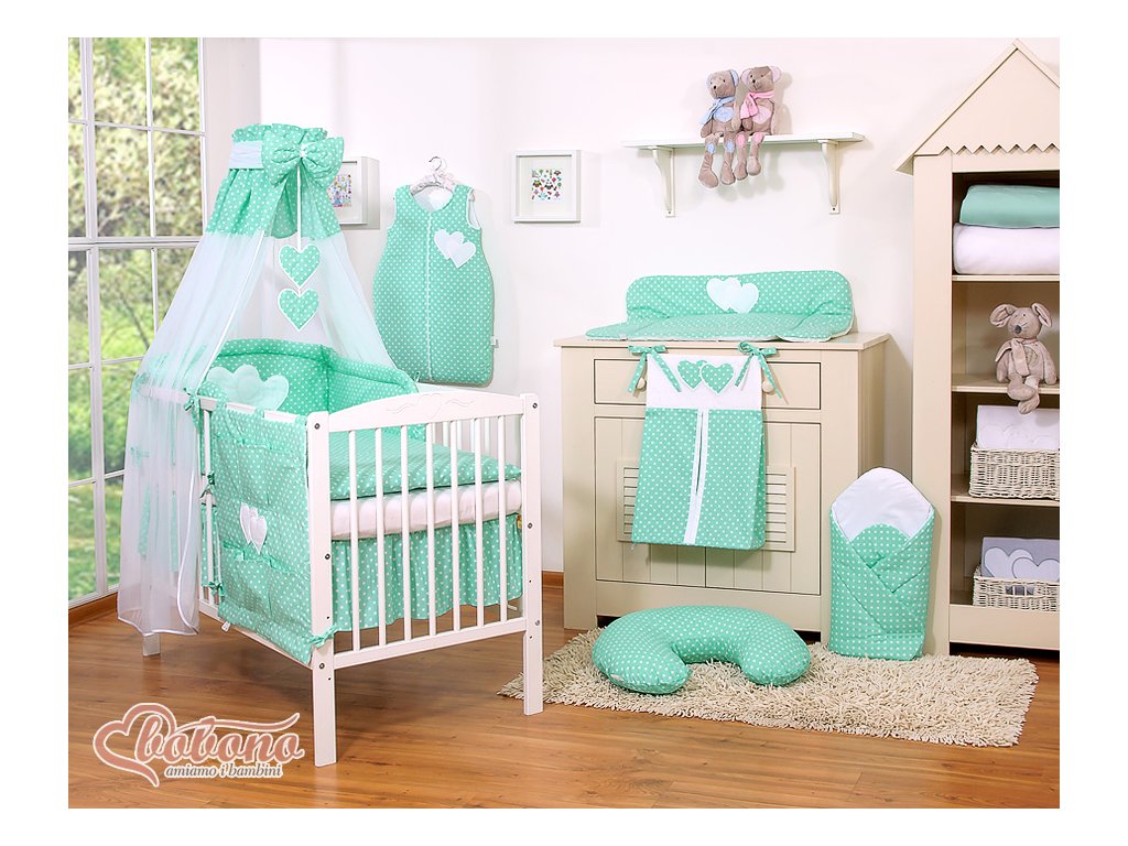 Nebesa šifónová, v horní části bavlněná. Sahají téměř až k zemi, pod spodní příčky postýlky, takže nespadnou dovnitř ani s matrací spuštěnou na nejnižší úroveň postýlky. Nebesa můžete upevnit na krátkou stranu postýlky, kdy budou krásně nařasené, ale lze je připevnit i na dlouhou stranu. Nebesa jsou doplněná o velkou, tlustou mašli a visící srdíčka, které přitahují pozornost dítěte v prvních měsících a účinně nahrazují kolotoč. Navíc k baldachýnu zdarma dostanete tylovou šerpu, která krásně doplní celou sadu a vypadá tak ještě elegantněji.