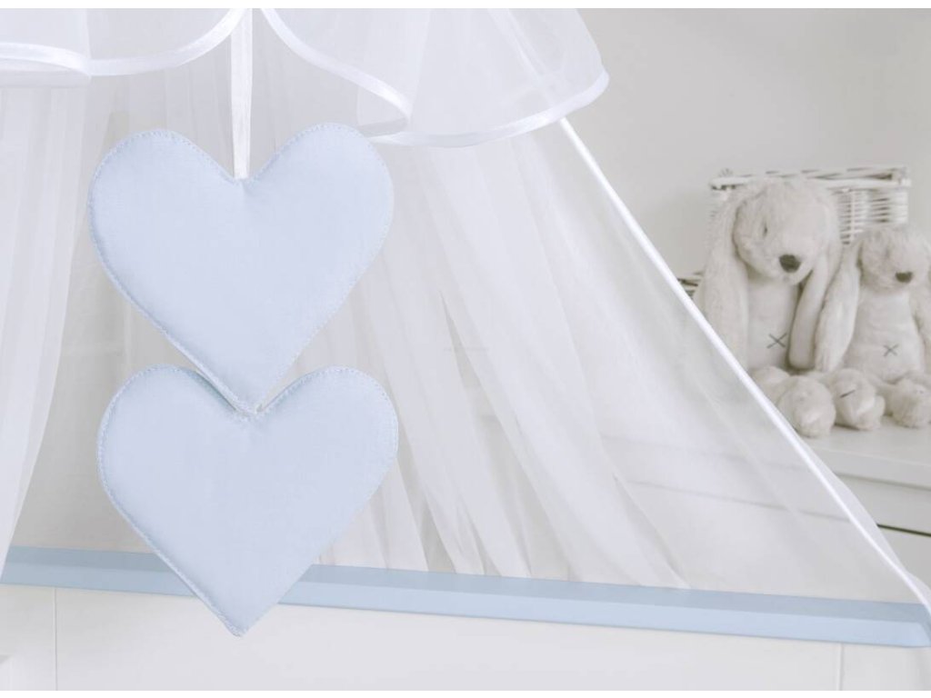 Moskytiéra z lehkého šifónu. Je dlouhá a široká, umožní Vám pevně zabalit jakoukoli postýlku. Sahá téměř až k zemi, pod spodní příčky postýlky, takže nespadne dovnitř ani s matrací spuštěnou na nejnižší úroveň postýlky. Okraje moskytiéry jsou zakončeny krásným hladkým saténovým lemováním. Moskytiéru můžete umístit jak na kratším, tak na delším boku postýlky. Je doplněná o velkou, tlustou mašli a visící srdíčka, které přitahují pozornost dítěte v prvních měsících a účinně nahrazují kolotoč