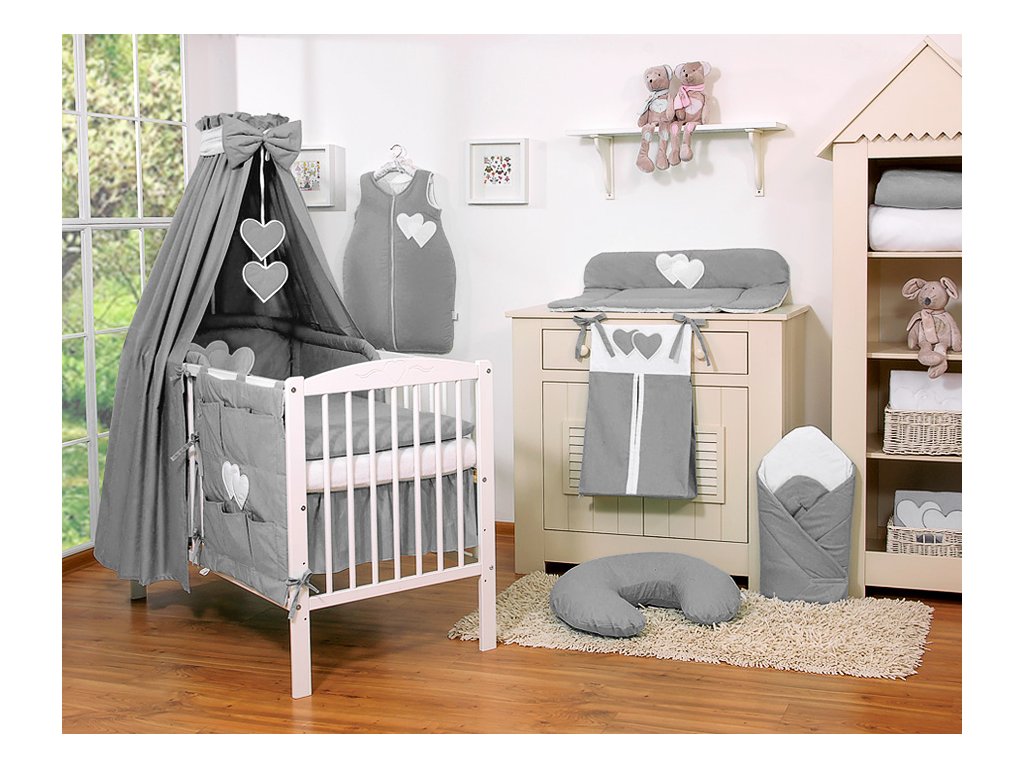 Nebesa celobavlněná. Sahají téměř až k zemi, pod spodní příčky postýlky, takže nespadnou dovnitř ani s matrací spuštěnou na nejnižší úroveň postýlky. Nebesa můžete upevnit na krátkou stranu postýlky, kdy budou krásně nařasené, ale lze je připevnit i na dlouhou stranu. Nebesa jsou doplněná o velkou, tlustou mašli a visící srdíčka, které přitahují pozornost dítěte v prvních měsících a účinně nahrazují kolotoč. Navíc k baldachýnu zdarma dostanete tylovou šerpu, která krásně doplní celou sadu a vypadá tak ještě elegantněji.