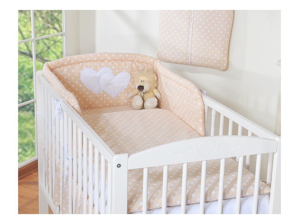 Mantinel je zaoblený, dodatečně prošívaný. K postýlce se přivazuje šňůrkami. Část mantinelu, která je za hlavičkou miminka, je zdobena velkou nášivkou srdíček.