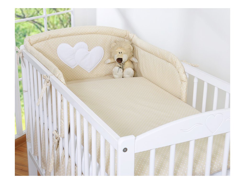 Mantinel je zaoblený, dodatečně prošívaný. K postýlce se přivazuje šňůrkami. Část mantinelu, která je za hlavičkou miminka, je zdobena velkou nášivkou srdíček.
